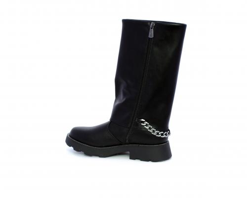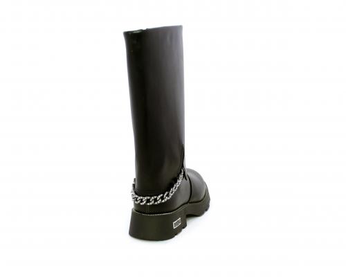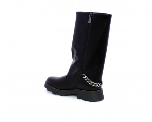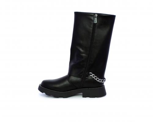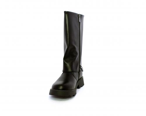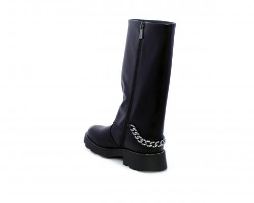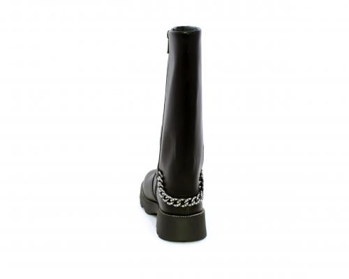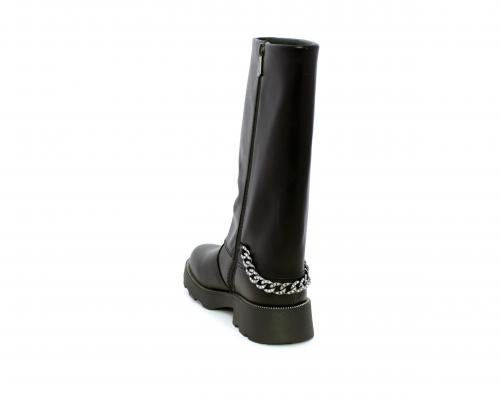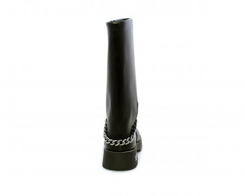 Stivale con chiusura laterale, fondo in gomma con medaglia in acciaio con logo, tomaia in pelle lateralmente catenella in acciaio con brillantini, sottopiede in pelle, fodera interna in tessuto, fusbet anatomico.