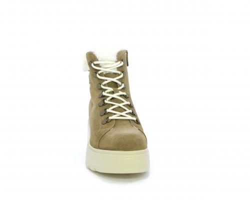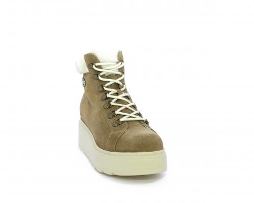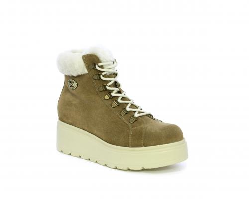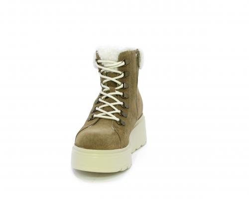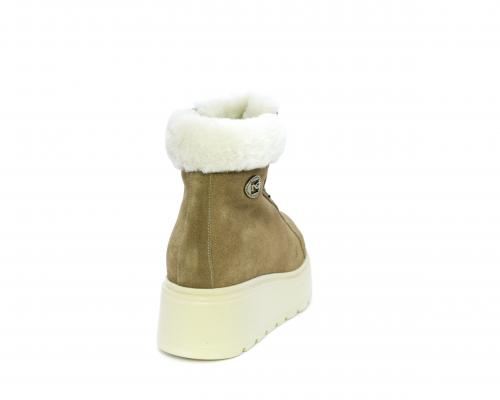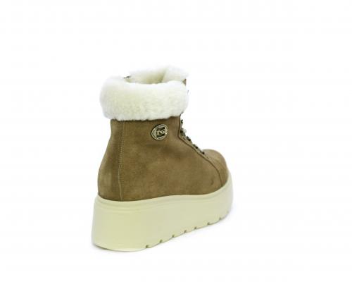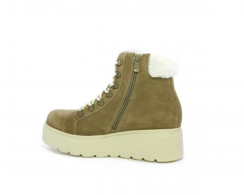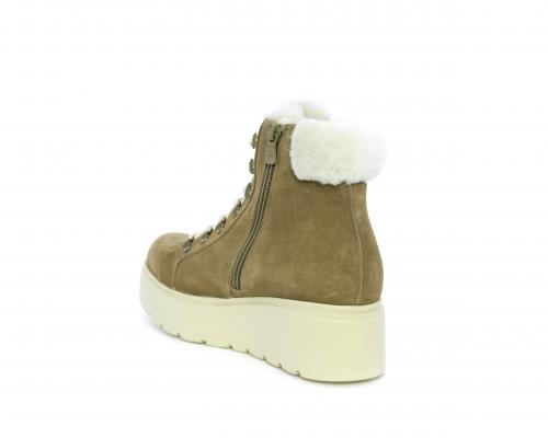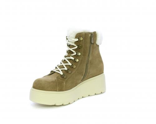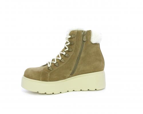 Tronchetto con zeppa e plateaux in gomma, con lacci e chiusura laterale, tomaia in camoscio con pelliccia ecologica, sottopiede in tessuto, fodera interna in pelle,fusbet estraibile in poliuretano Dry-Go, con doppia capacità sia di assorbire il sudore sia di asciugarsi rapidamente, inoltre ha anche la funzione MEMORY che si modella al piede garantendo confort e benessere.