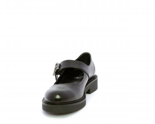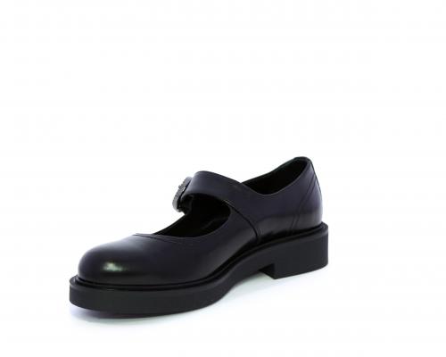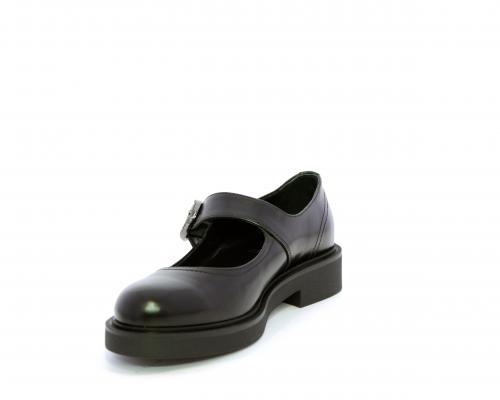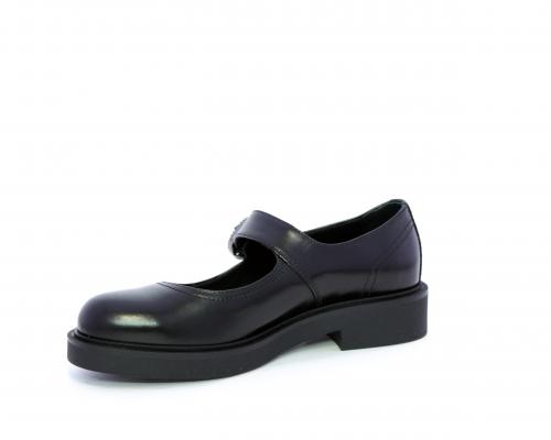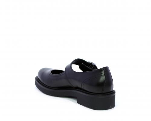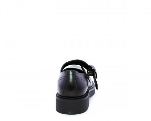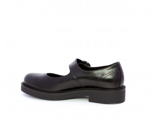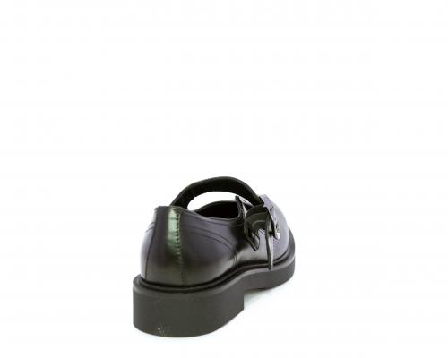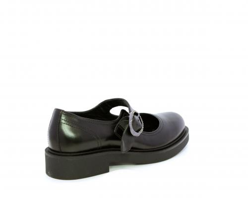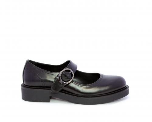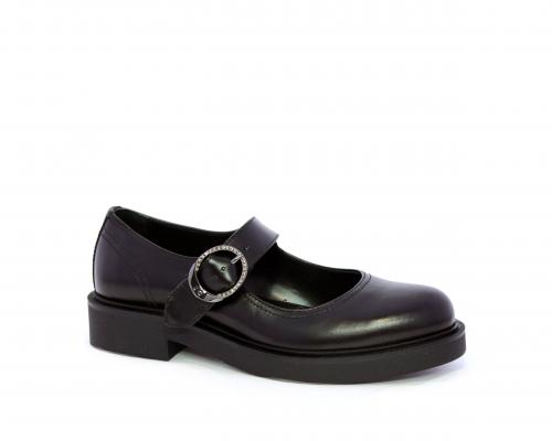 Scarpa modello ballerina con cinturino in pelle regolabile, tacco e fondo in gomma, tomaia in pelle con brillantini sulla fibbia, sottopiede e fodera interna in pelle, fusbet con memory.