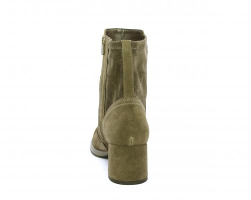 Tronchetto con punta tonda, chiusura laterale, tacco largo rivestito in camoscio, tomaia in camoscio con parte laterale in tessuto elasticizzato, sottopiede e fodera interna in pelle, fusbet con memory.
