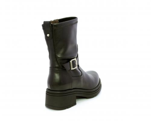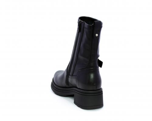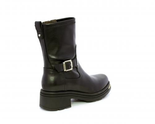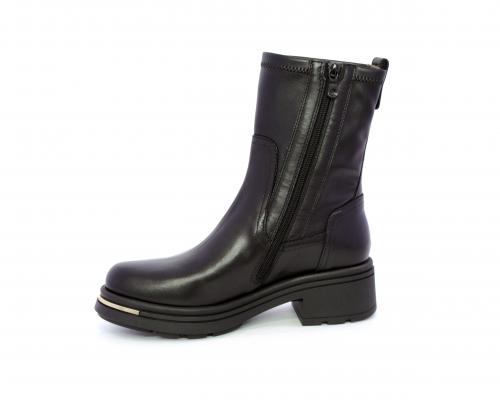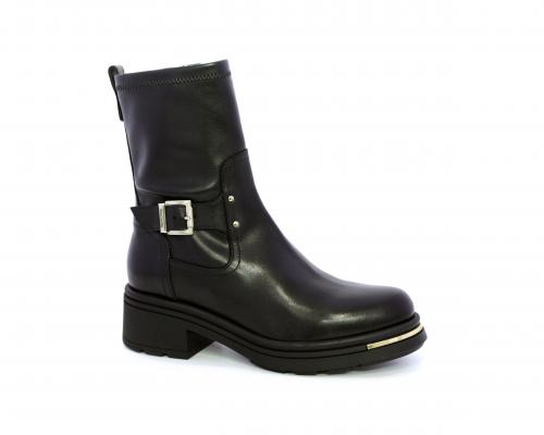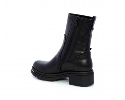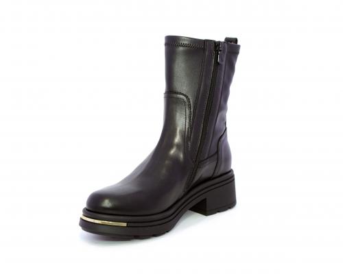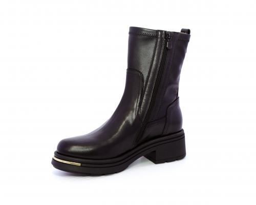 Stivaletto con chiusura laterale, tacco e plateaux in gomma, tomaia in pelle con rifiniture in oro e la parte della tomaia intorno alla caviglia è in pelle elasticizzata, sottopiede in tessuto, fodera interna in pelle e parte intorno alla caviglia in tessuto, fusbet in poliuretano Dry-Go, che ha la capacità di assorbimento del sudore e rapida asciugatura, inoltre offre l'innovativa funzione Memory che si modella al piede donando confort e benessere.
