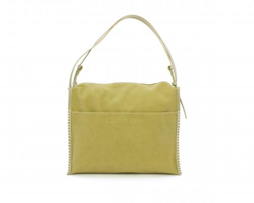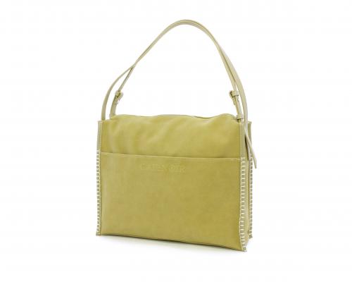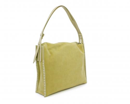 Borsa monospalla con forma rettangolare, doppio manico lungo regolabile, in camoscio e rifiniture in ecopelle, taschino nella parte anteriore con calamita, chiusura generale della borsa con cerniera, fodera interna in tessuto con doppio taschino uno aperto e uno chiuso con zip.