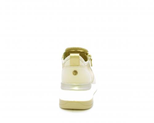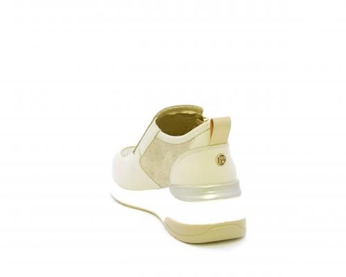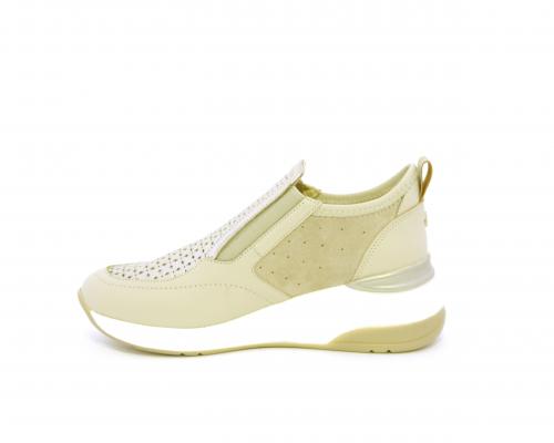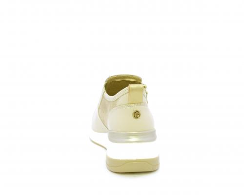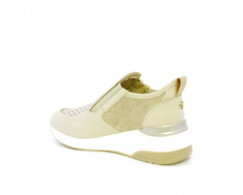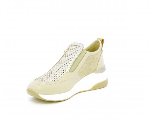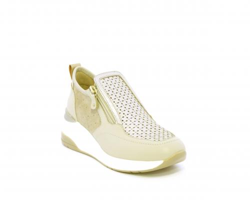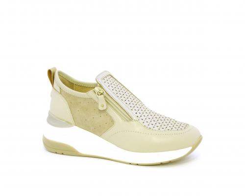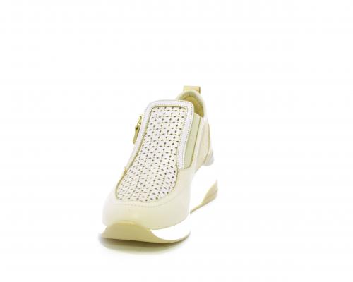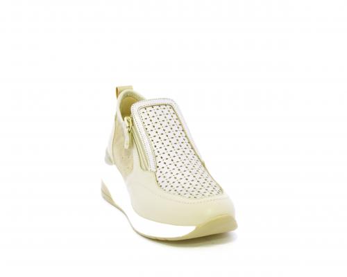 Sneakers senza lacci con cerniera ed elastico laterale, zeppa e plateaux in gomma, tomaia in pelle con parte laterale in suede, sottopiede e fodera interna in pelle, fusbet anatomico estraibile.