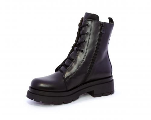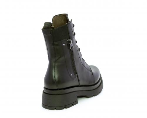 Tronchetto con lacci e chiusura laterale, tacco e plateaux in gomma, tomaia in pelle con rifitiniture in acciaio ed elastico laterale intorno alla caviglia, sottopiede e fodera interna in pelle,fusbet con MEMORY che si modella al piede garantendo confort e benessere.