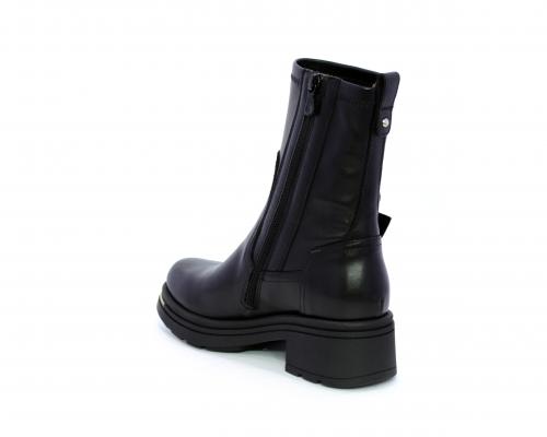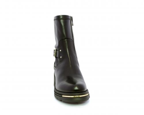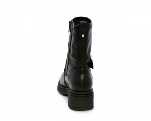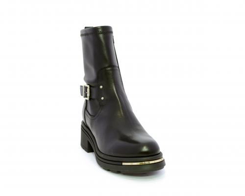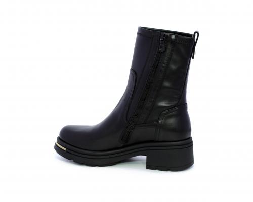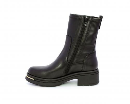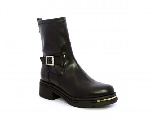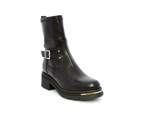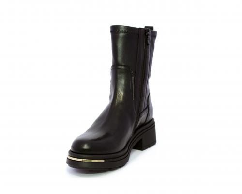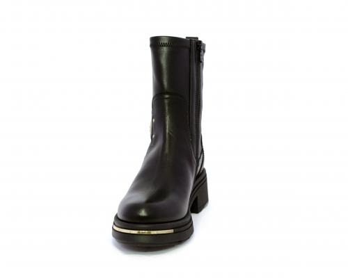 Stivaletto con chiusura laterale, tacco e plateaux in gomma, tomaia in pelle con rifiniture in oro e la parte della tomaia intorno alla caviglia è in pelle elasticizzata, sottopiede in tessuto, fodera interna in pelle e parte intorno alla caviglia in tessuto, fusbet in poliuretano Dry-Go, che ha la capacità di assorbimento del sudore e rapida asciugatura, inoltre offre l'innovativa funzione Memory che si modella al piede donando confort e benessere.
