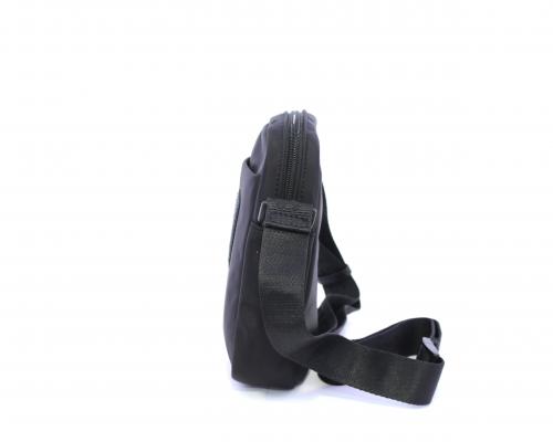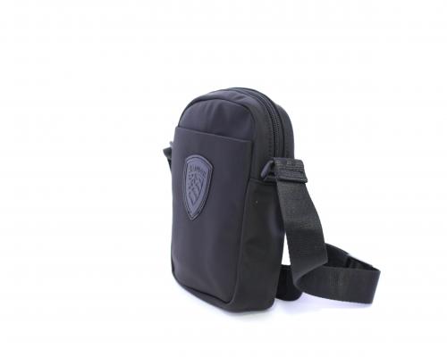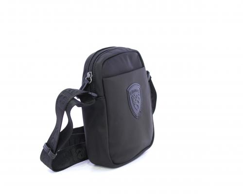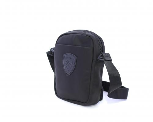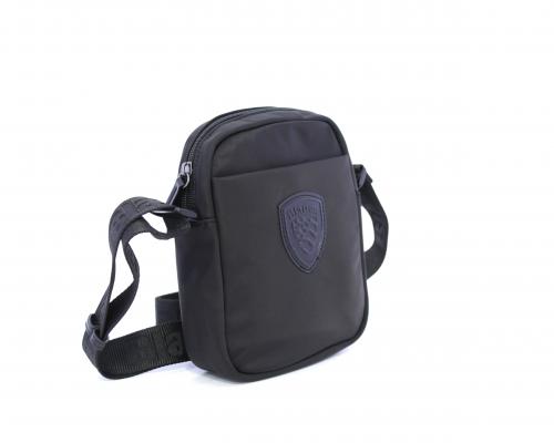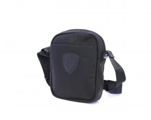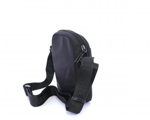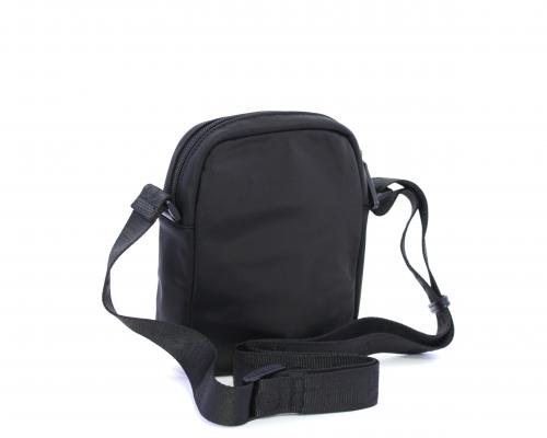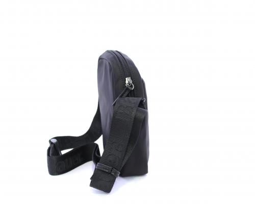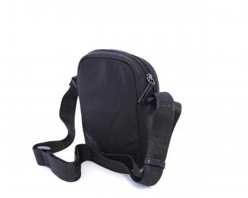 Tracolla in tessuto, taschino anteriore con clip e logo centrale in pelle, chiusura generale con cerniera, tracolla regolabile in tessuto con logo inciso.