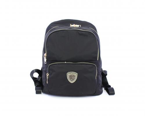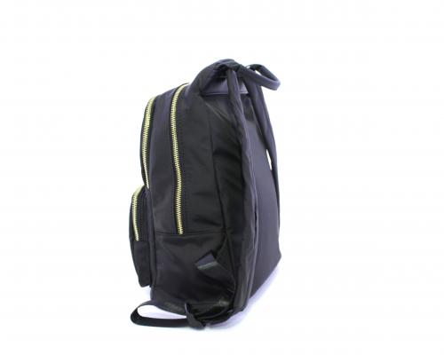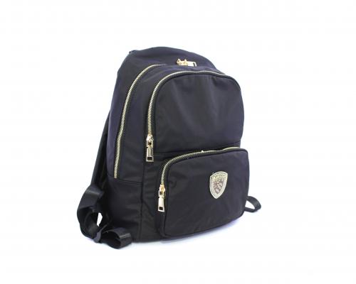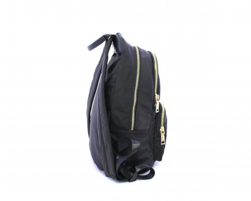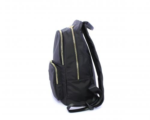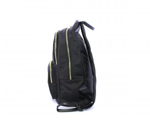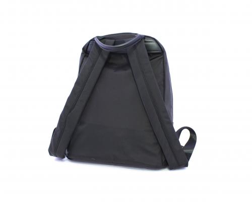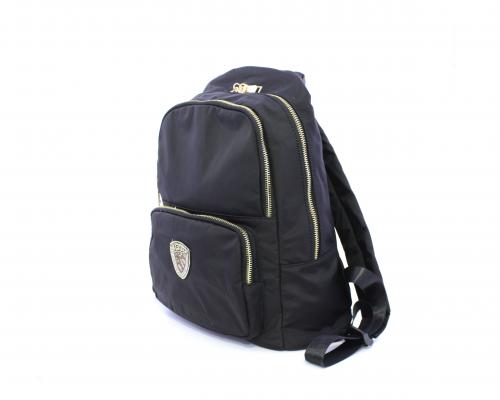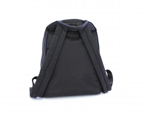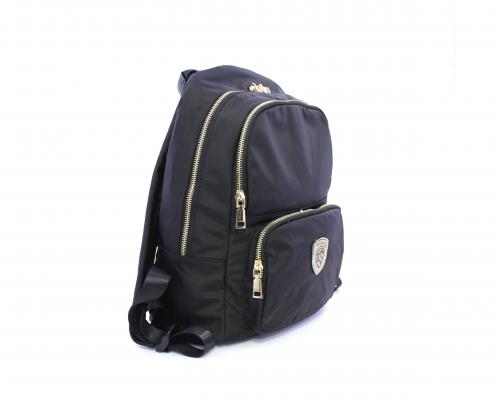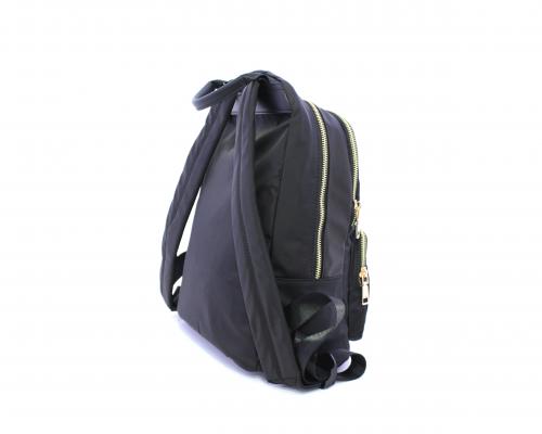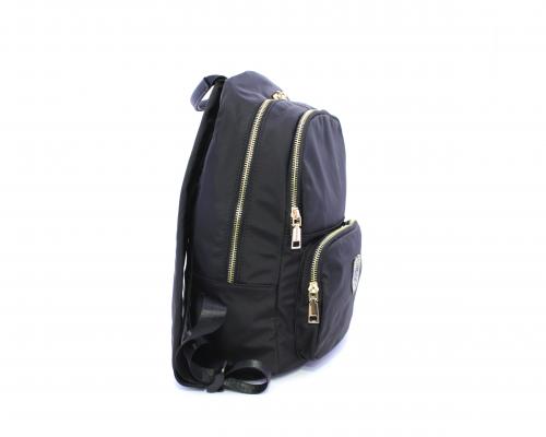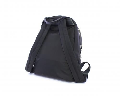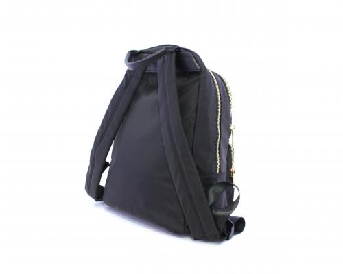 Zaino in tessuto con rifiniture in pelle e tracolle regolabili in tessuto, lo zaino è costituito da uno scomparto grande e due taschini nella parte anteriore uno più grande e uno più piccolo con logo con brillantini, chiusura generale della zaino con cerniera, fodera interna in tessuto e nel vano più grande all'interno c'è un taschino chiuso con zip.