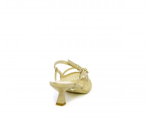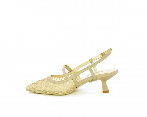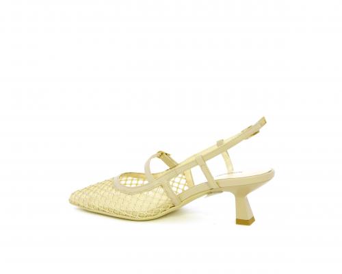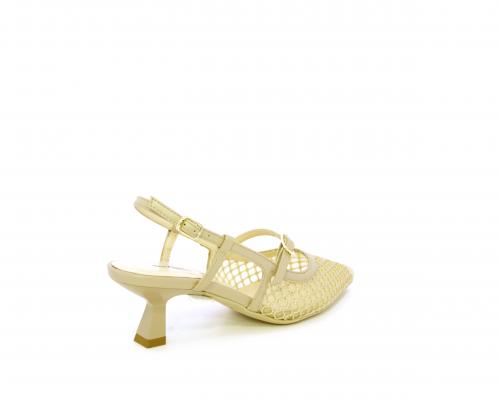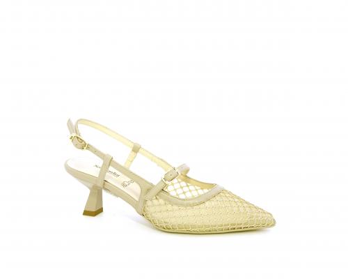 Scarpa modello chanel, fondo in gomma, tacco a rocchetto, tomaia in pelle con parti in tessuto, lateralmente fibbia regolabile, sottopiede e fodera interna in pelle, fusbet dotato di memory ed elevato assorbimento degli urti donando confort e benessere.