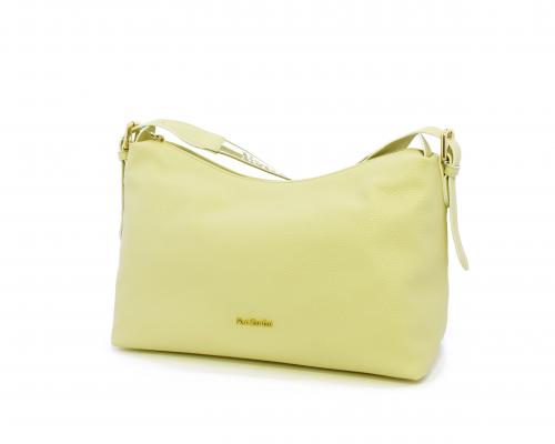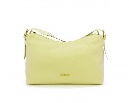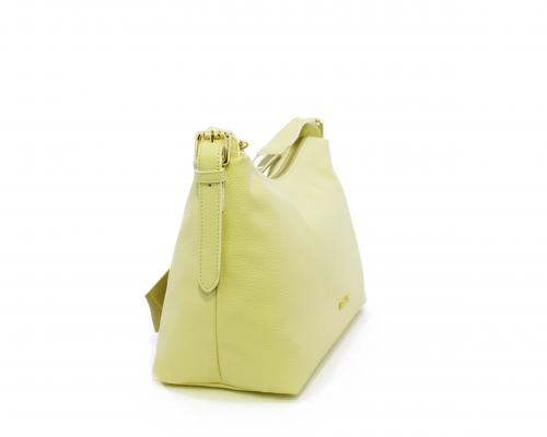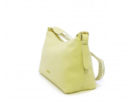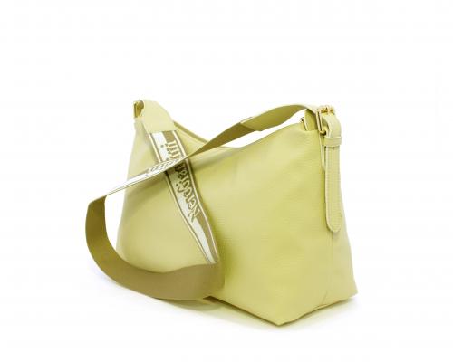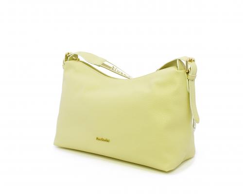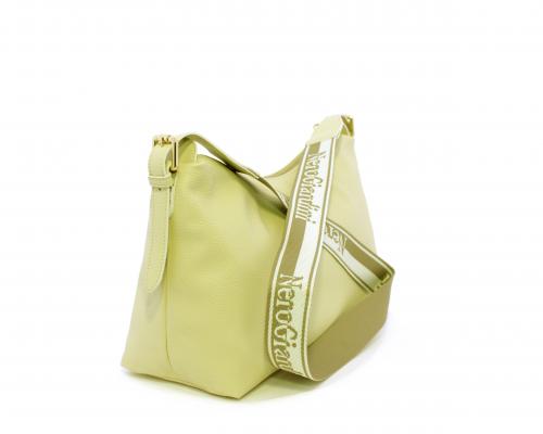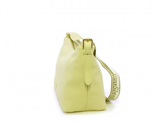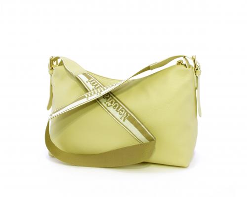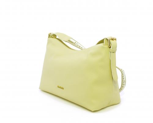 Borsa a tracolla modello sacca, manico lungo in tessuto regolabile, rifiniture color platino, chiusura generale della borsa con cerniera, fodera interna in tessuto, all'interno doppio taschino uno aperto e uno chiuso con zip.