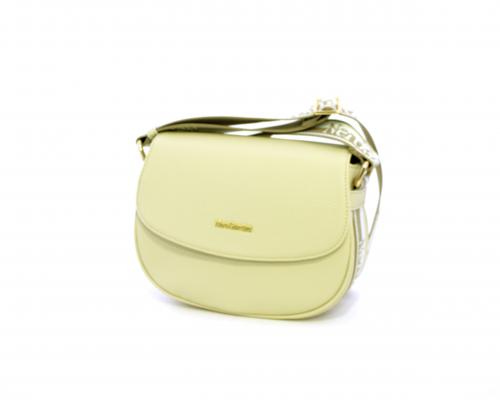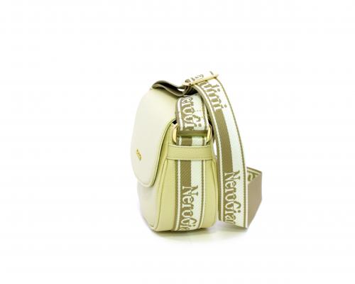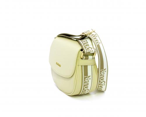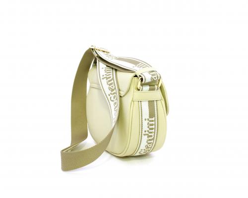 Borsa a tracolla in pelle a forma di mezza luna, tracolla in tessuto con logo stampato e regolabile, rifiniture color platino, chiusura generale della borsa con clip,fodera interna in tessuto con doppio taschino uno aperto e uno chiuso con zip.