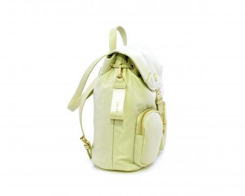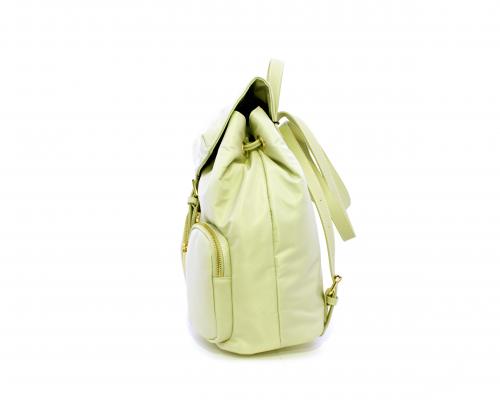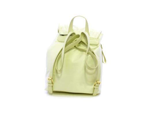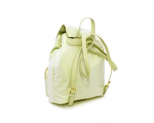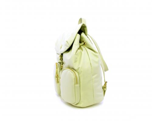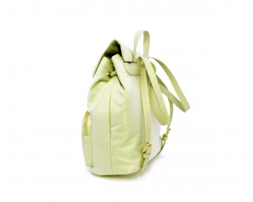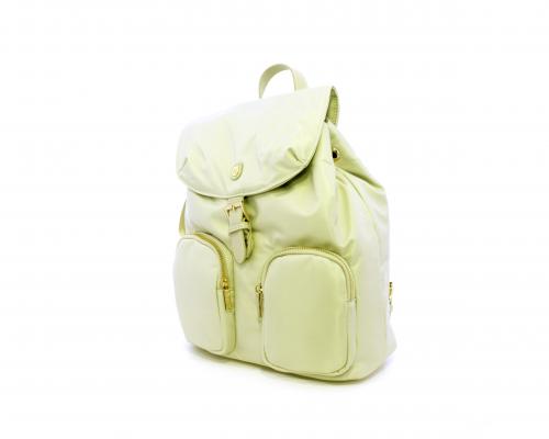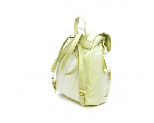 Zaino in tessuto, due taschini nella parte frontale chiusi con zip, chiusura generale con clip e laccio per stringere lo zaino, tracolle regobili in pelle, fodera interna in tessuto, all'interno ci sono due taschini uno aperto e uno chiuso con zip.