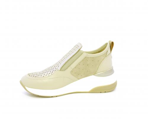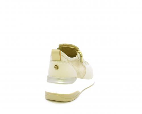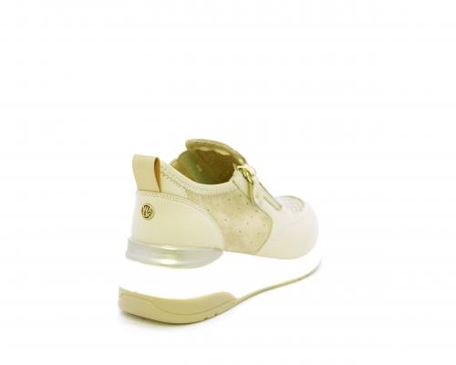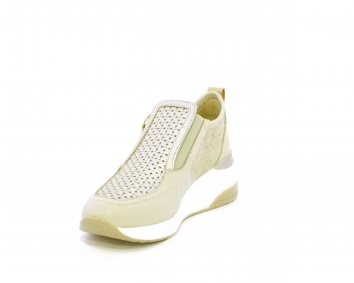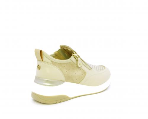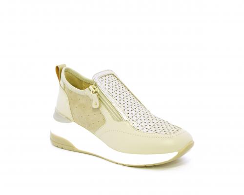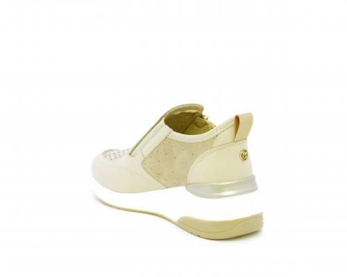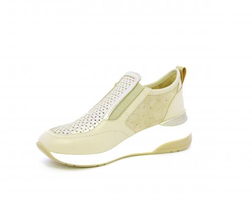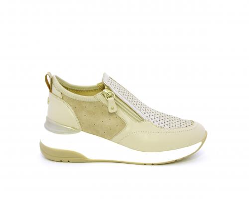 Sneakers senza lacci con cerniera ed elastico laterale, zeppa e plateaux in gomma, tomaia in pelle con parte laterale in suede, sottopiede e fodera interna in pelle, fusbet anatomico estraibile.