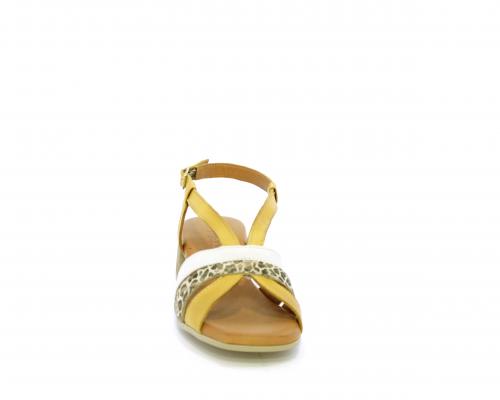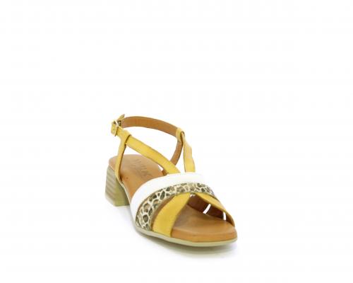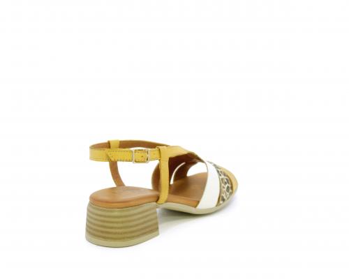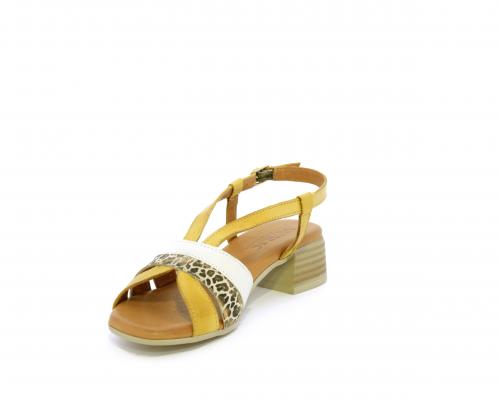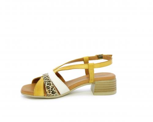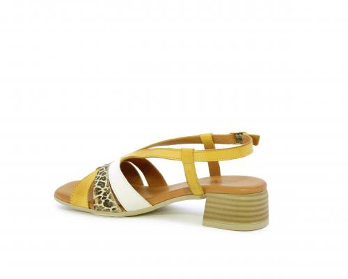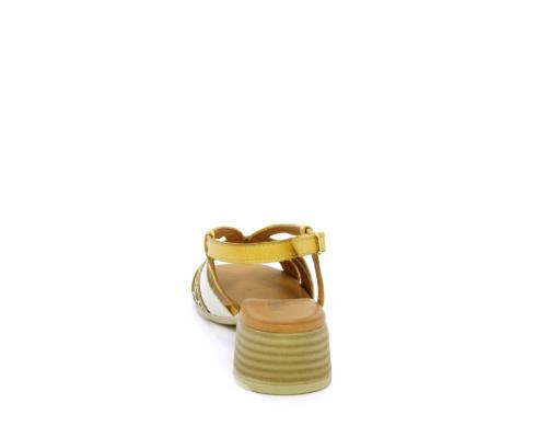 Sandalo con tacco effetto legno, fondo in gomma, tomaia in pelle con fascie in pelle colorata sulla pianta e fibbia regolabile dietro la caviglia, sottopiede e fodera intena in pelle, fusbet anatomico con memory.