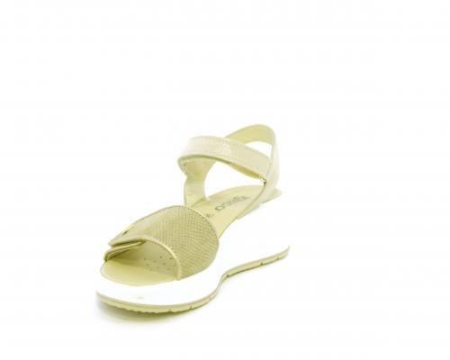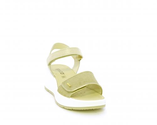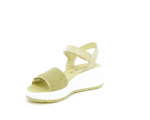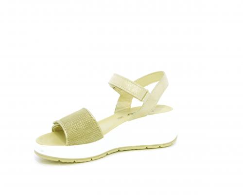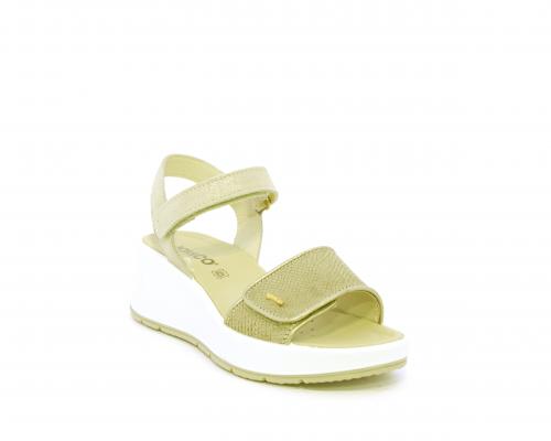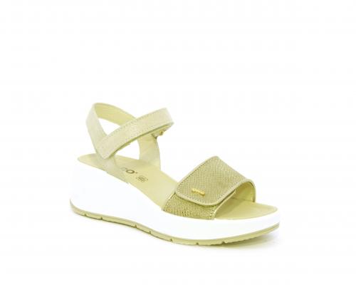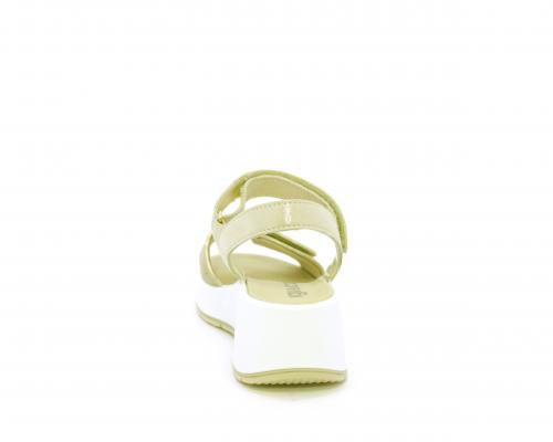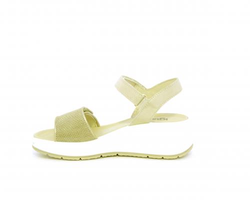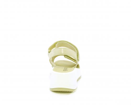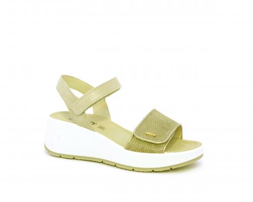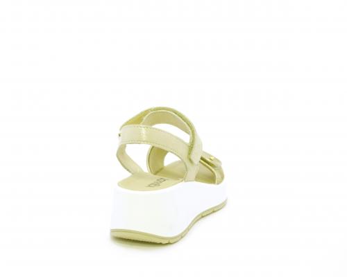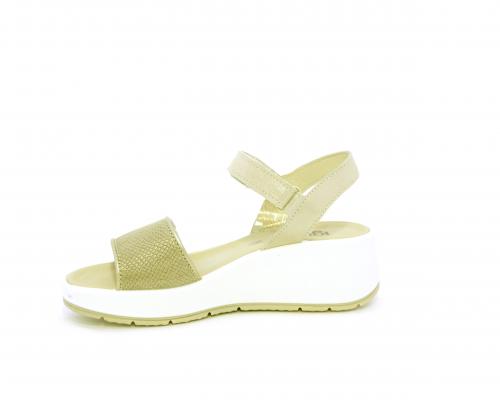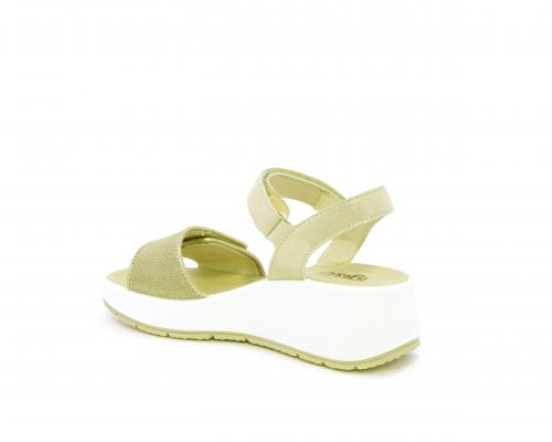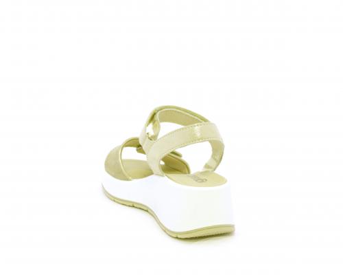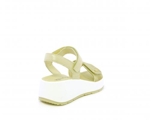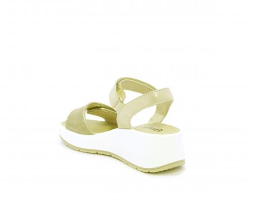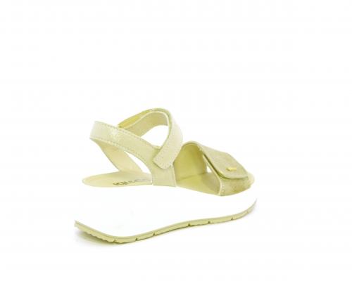 Sandalo con zeppa e plateaux in gomma, tomaia in pelle satinata con doppio velcro sia sulla pianta del piede sia intorno alla caviglia, sottopiede e fodera interna in pelle, fusbet anatomico.