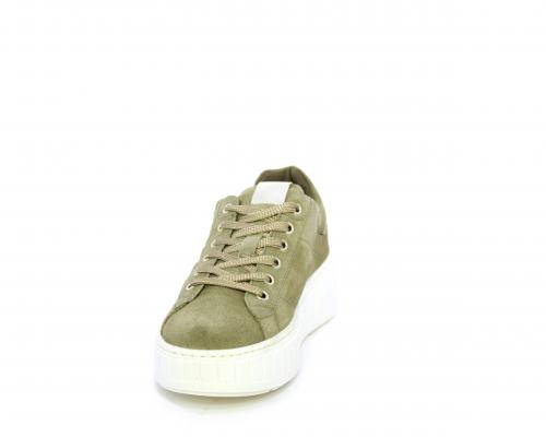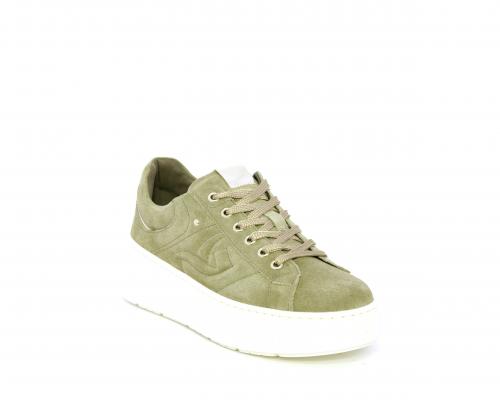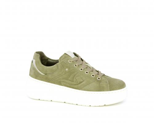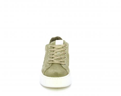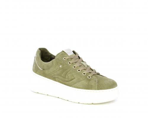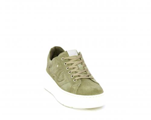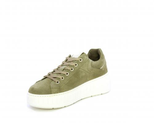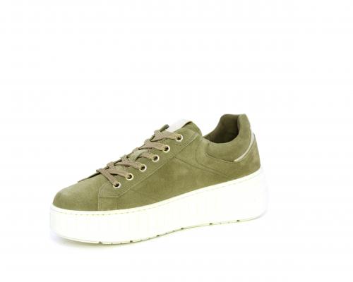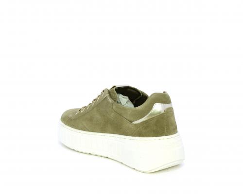 Sneakers con lacci, zeppa e platform in gomma, tomaia in camoscio con rifiniture platino, sottopiede in tessuto, fodera interna in pelle, fusbet estraibile in poliuretano Dry-Go, con doppia capacità sia assorbire il sudore sia di asciugarsi rapidamente, inoltre ha anche la funzione MEMORY che si modella al piede garantendo confort e benessere.
