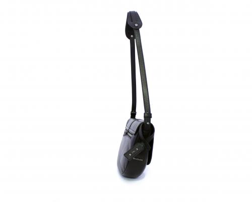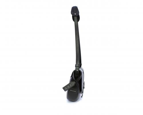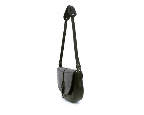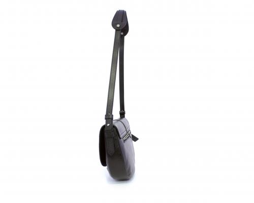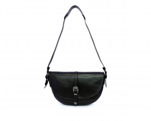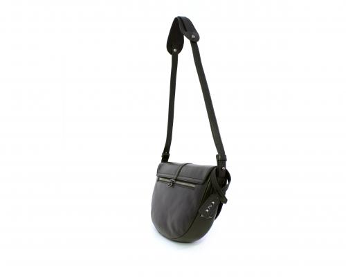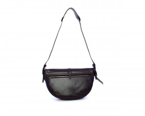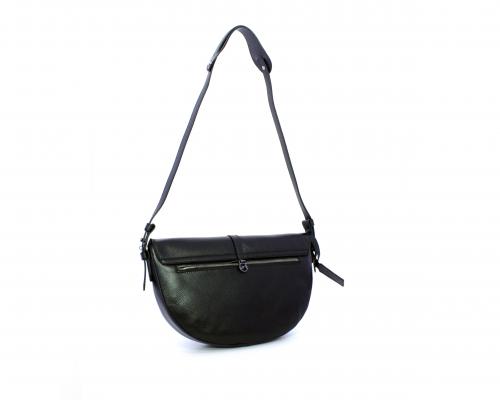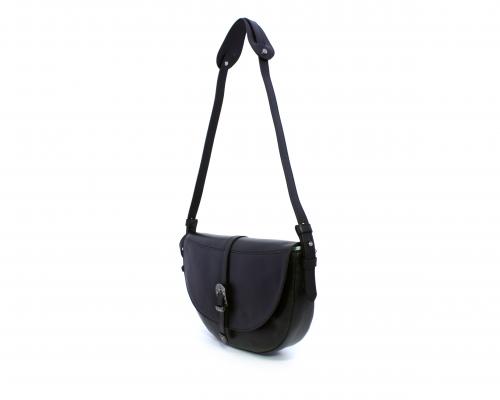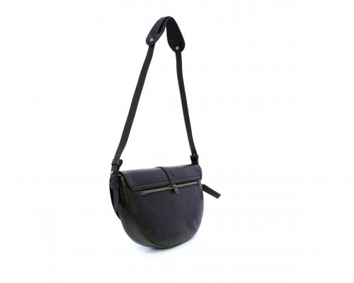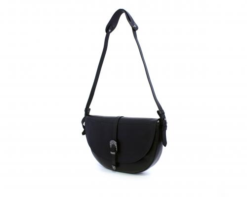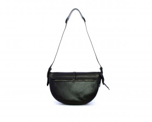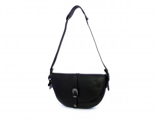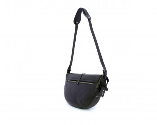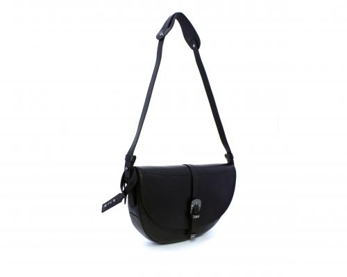 Borsa a froma di mezza-luna, tracolla lunga in pelle regolabile, fibbia chiusa con clip, fodera interna in tessuto, all'interno doppio taschino uno aperto e uno chiuso.