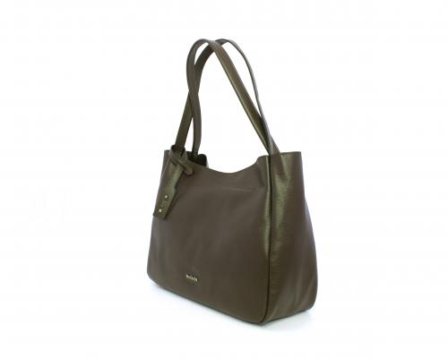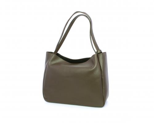 Borsa monospalla in pelle, forma rettangolare, doppio manico lungo in pelle, rifiniture in acciaio, chiusura generale della borsa con cerniera, all'interno pochette in pelle che può essere anche staccata.