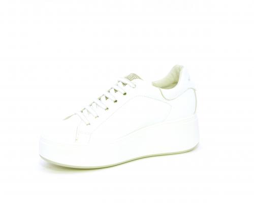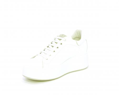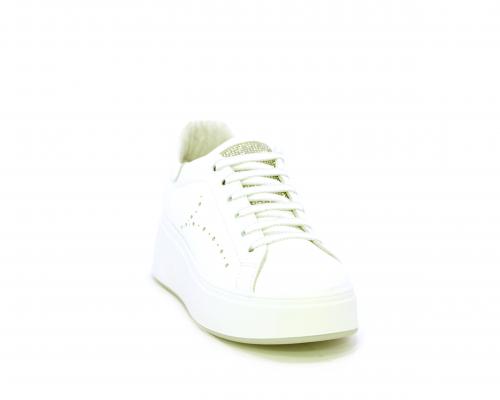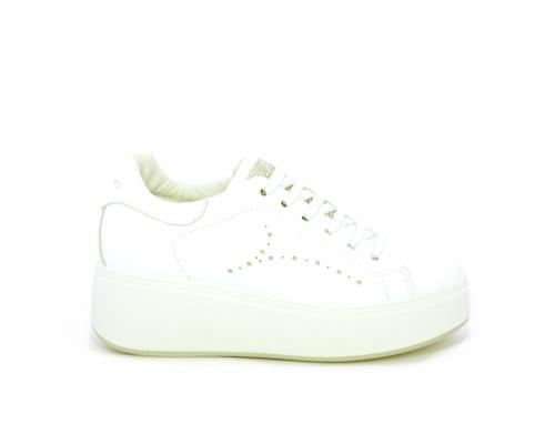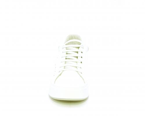 Sneakers con lacci, platfoarm in gomma bianco, tomaia in pelle e fascia di brillantini sulla linguetta della calzatura, sottopiede e fodera interna in pelle, fusbet estraibile.