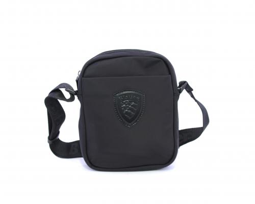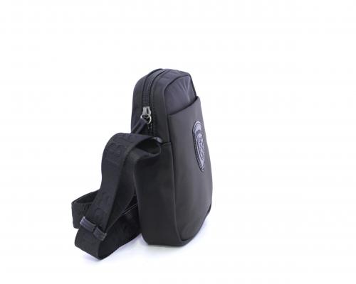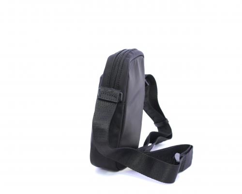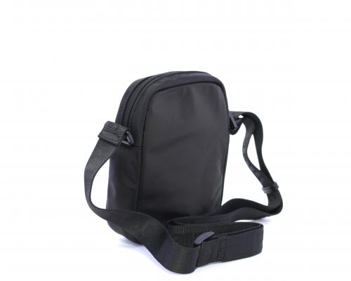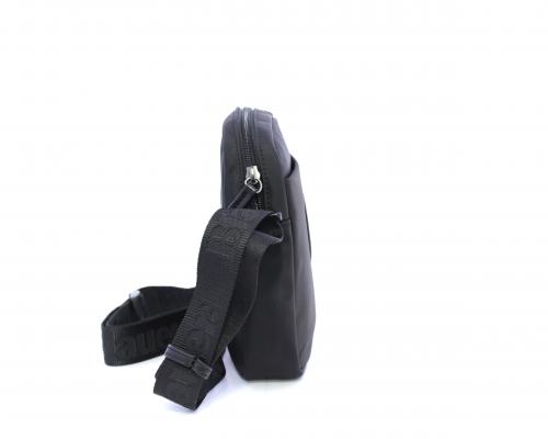Tracolla in tessuto, taschino anteriore con clip e logo centrale in pelle, chiusura generale con cerniera, tracolla regolabile in tessuto con logo inciso.