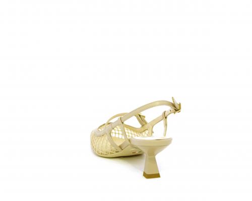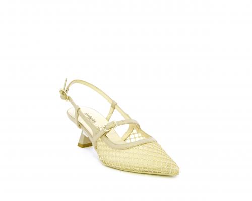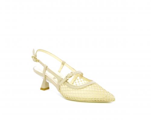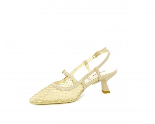 Scarpa modello chanel, fondo in gomma, tacco a rocchetto, tomaia in pelle con parti in tessuto, lateralmente fibbia regolabile, sottopiede e fodera interna in pelle, fusbet dotato di memory ed elevato assorbimento degli urti donando confort e benessere.