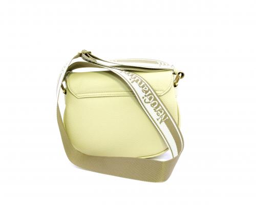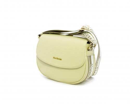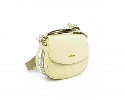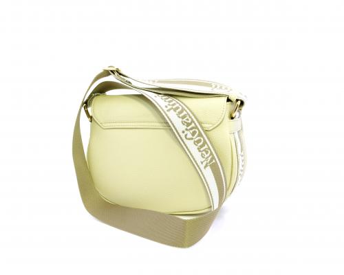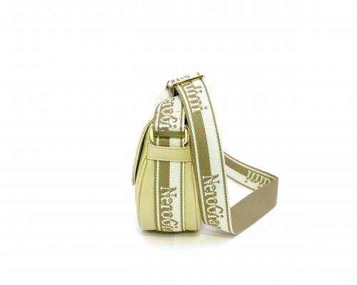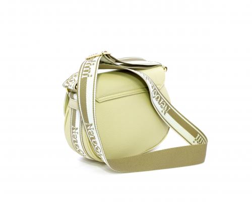 Borsa a tracolla in pelle a forma di mezza luna, tracolla in tessuto con logo stampato e regolabile, rifiniture color platino, chiusura generale della borsa con clip,fodera interna in tessuto con doppio taschino uno aperto e uno chiuso con zip.