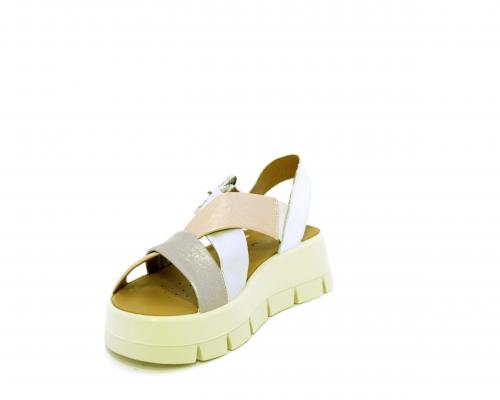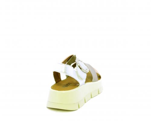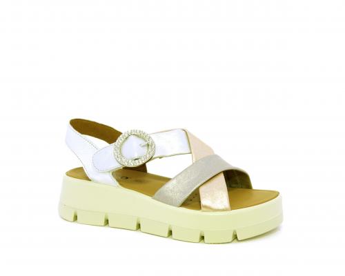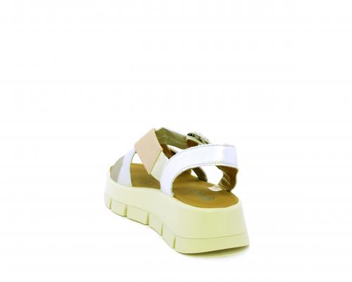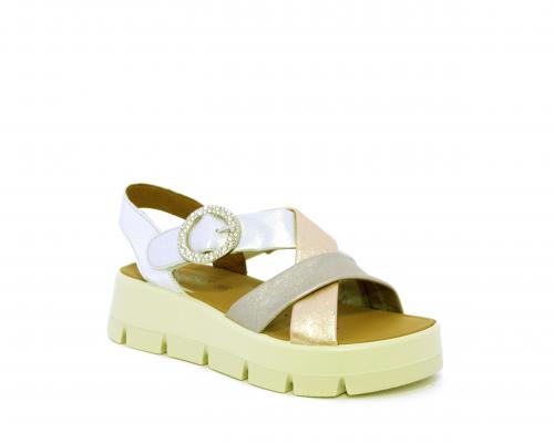 Sandalo con fondo in gomma, tomaia in pelle satinata con incrocio sul collo del piede, fibbia regolabile ed elastico, sottopiede in pelle, fusbet anatomico.