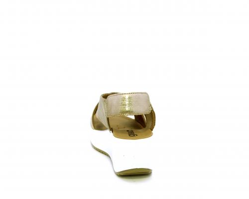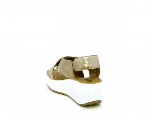 Sandalo con fondo in gomma, tomaia in pelle satinata, modello ad incrocio con doppio elastico al cinturino dietro la caviglia, sottopiede in pelle, fusbet anatomico.