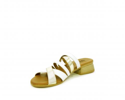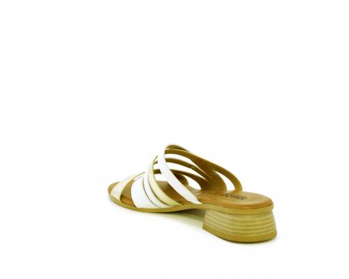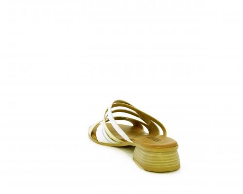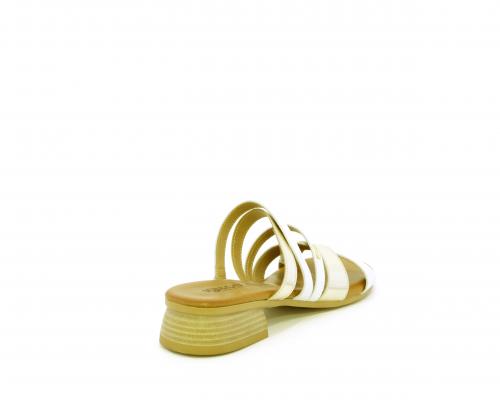 Sandalo con tacco effetto legno, fondo in gomma, tomaia in pelle bianca e pelle satinata platino con elastico alla fascia sul collo del piede, sottopiede e fodera interna in pelle, fusbet con memory.