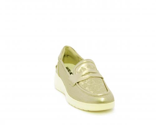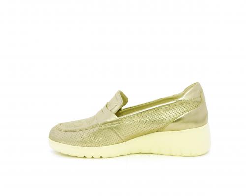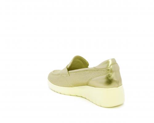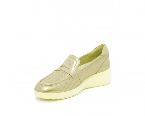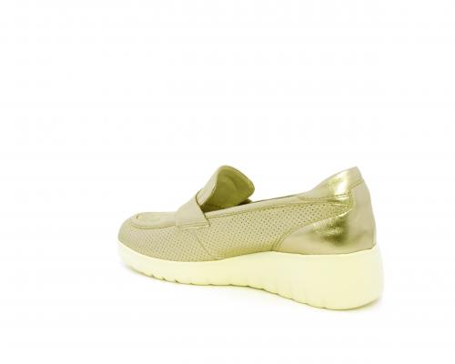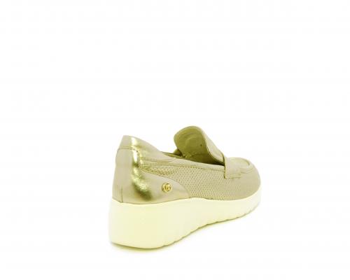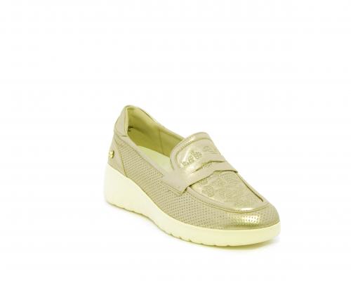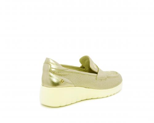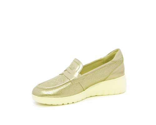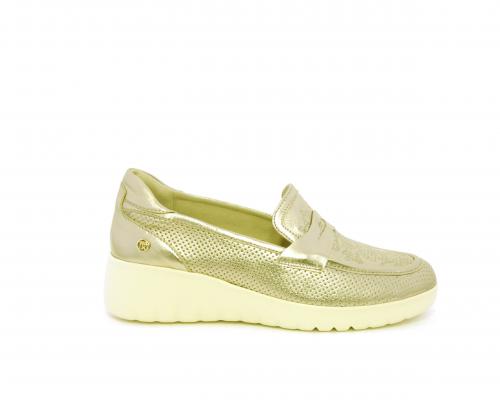 Mocassino con zeppa e plateux in gomma, tomaia in pelle satinata, sottopiede in pelle, fodera intena in suede, fusbet estraibile con memory flex per rendere la calzatura ancora più flessibile e leggera.