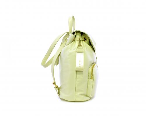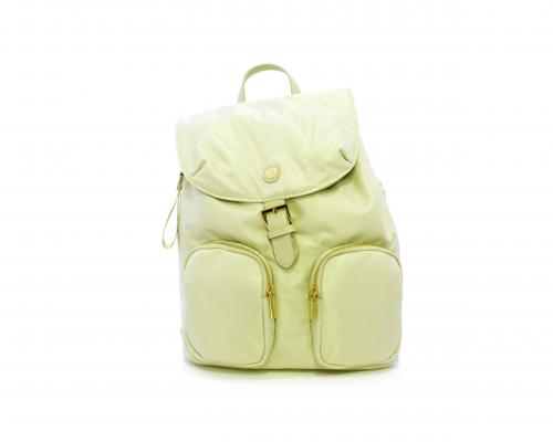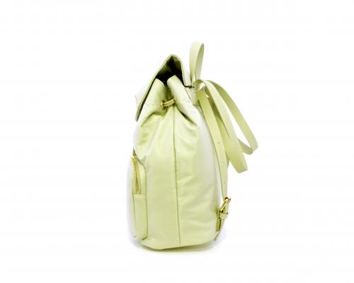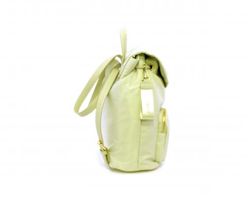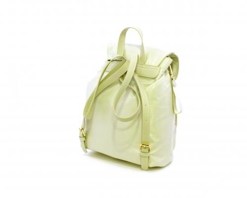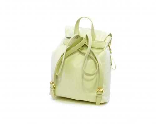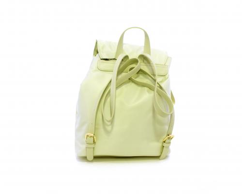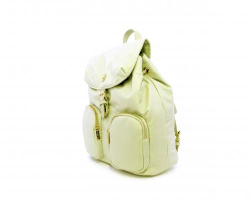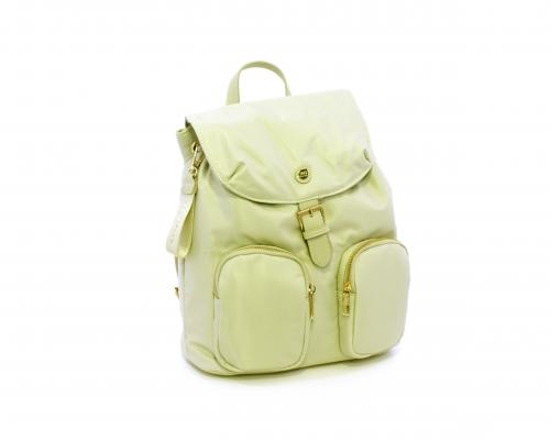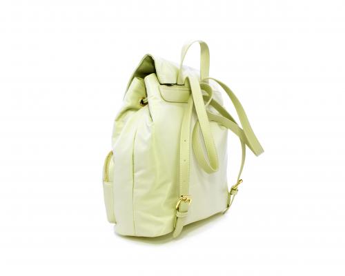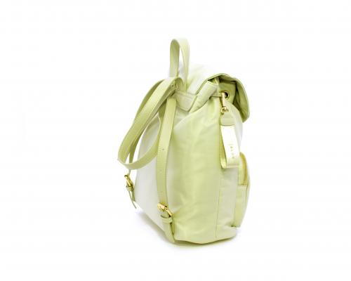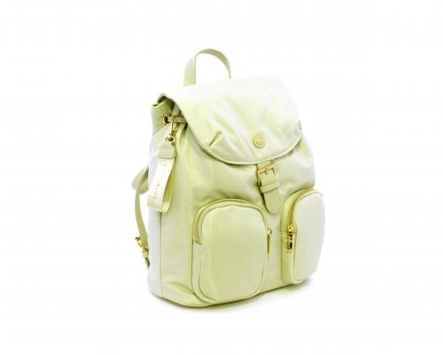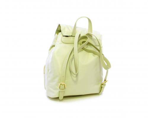 Zaino in tessuto, due taschini nella parte frontale chiusi con zip, chiusura generale con clip e laccio per stringere lo zaino, tracolle regobili in pelle, fodera interna in tessuto, all'interno ci sono due taschini uno aperto e uno chiuso con zip.