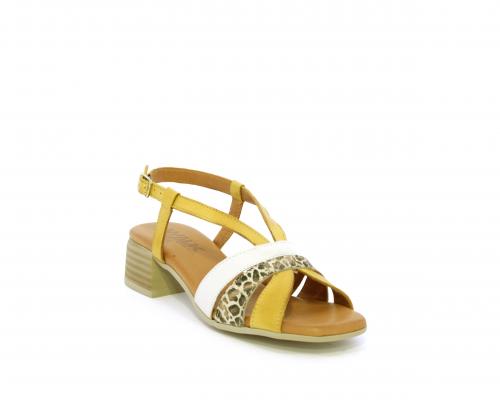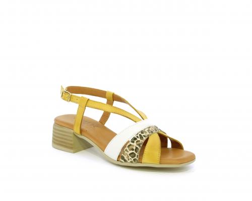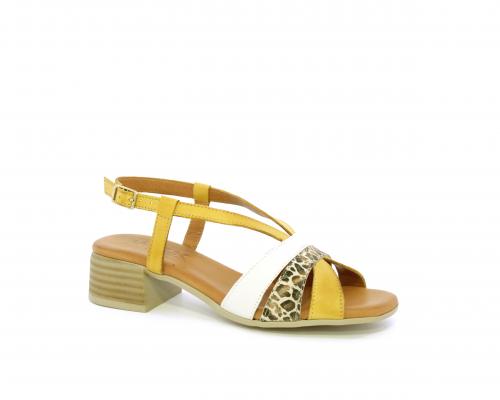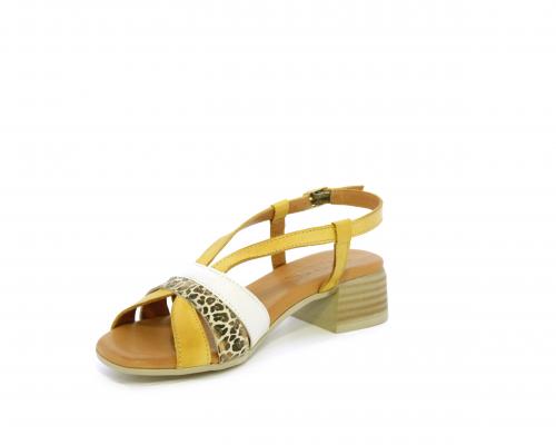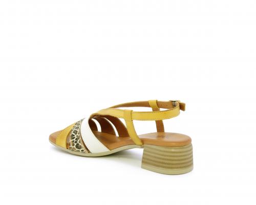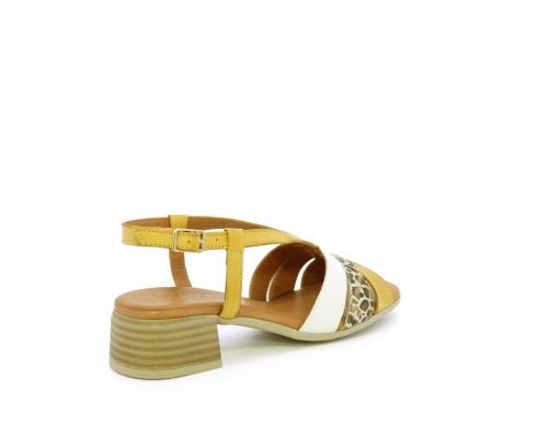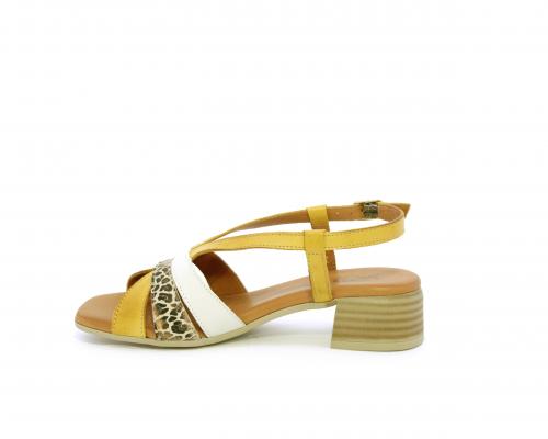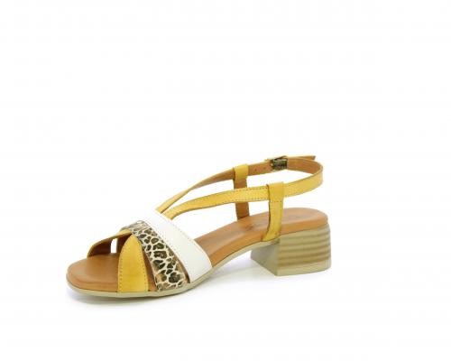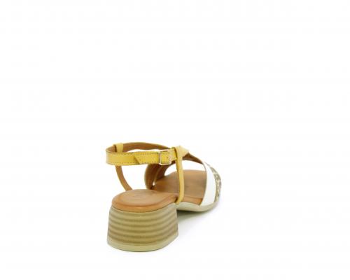 Sandalo con tacco effetto legno, fondo in gomma, tomaia in pelle con fascie in pelle colorata sulla pianta e fibbia regolabile dietro la caviglia, sottopiede e fodera intena in pelle, fusbet anatomico con memory.