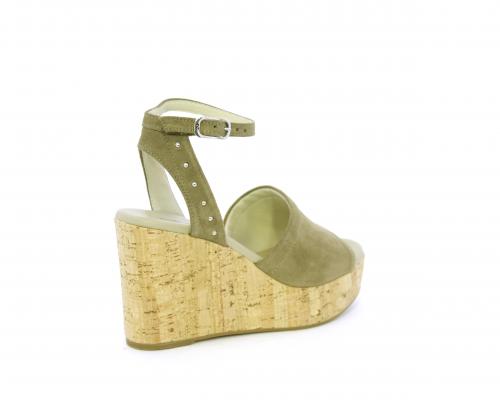 Zeppa in sughero con tomaia in nabuk, cinturino intorno alla caviglia, rifiniture in acciaio, sottopiede e fodera interna in pelle, fusbet con memory.