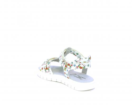 Sandalo in pelle con stampe, doppio velcro, uno intorno alla caviglia e un altro nella fascia posta nella pianta del piede, sottopiede e fodera interna in pelle.