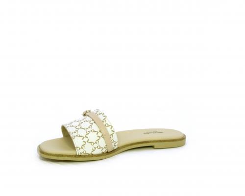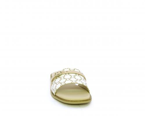 Ciabatta con tacco in gomma, tomaia in pelle stampata e rifiniture in pelle rosa e fibbia con brillantini, sottopiede in pelle, fusbet anatomico con memory foam.