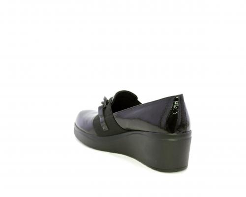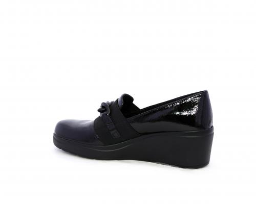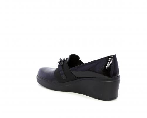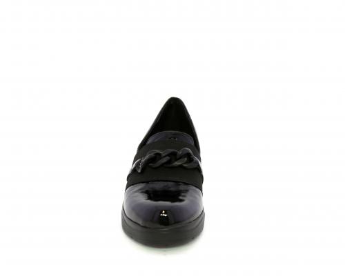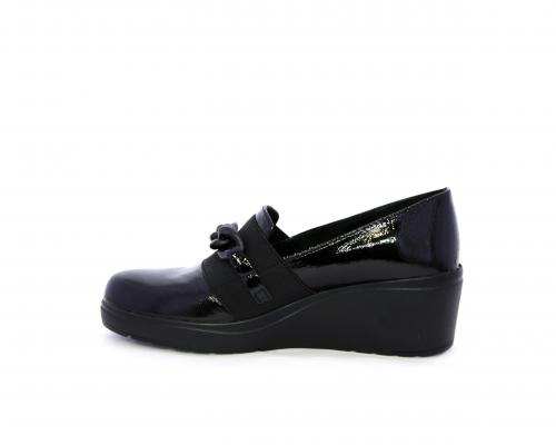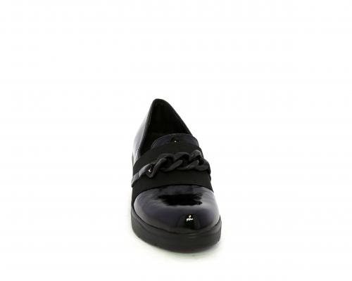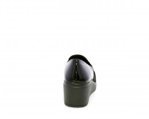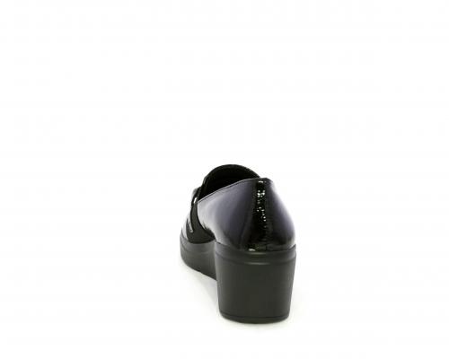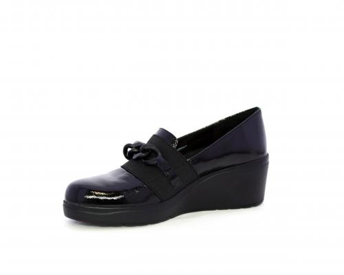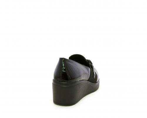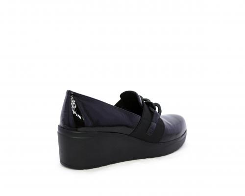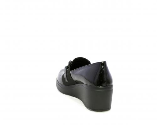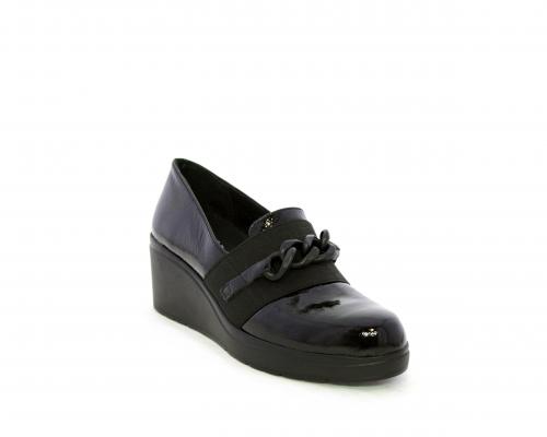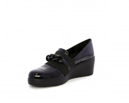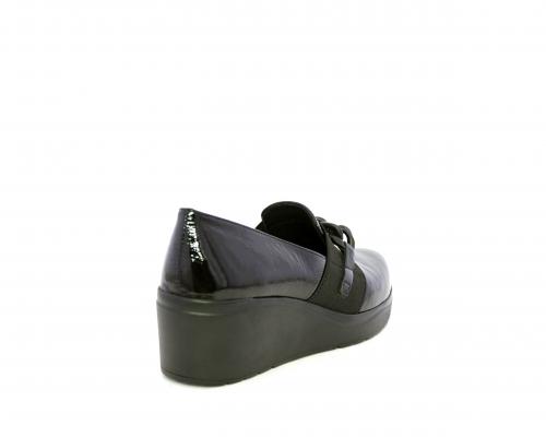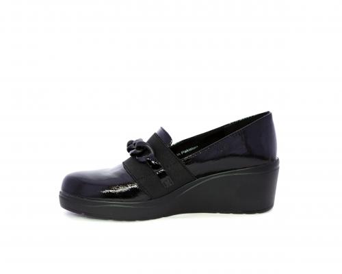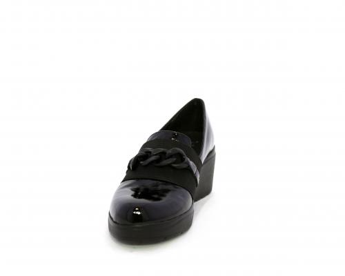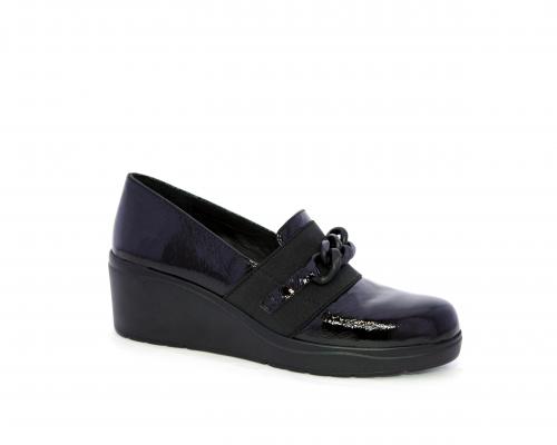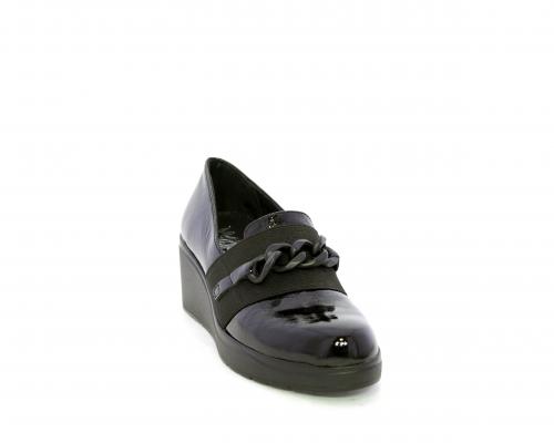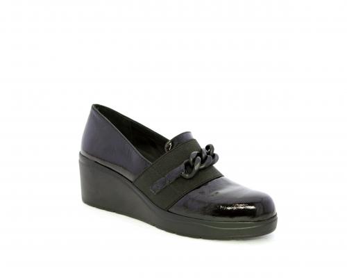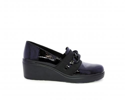 Mocassino con zeppa in gomma, tomaia in vernice con elastico sul collo del piede e catena, sottopiede in pelle, fodera interna in tessuto, fusbet anatomico estraibile.