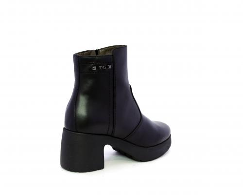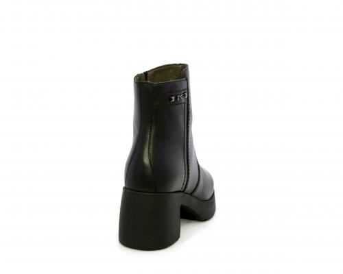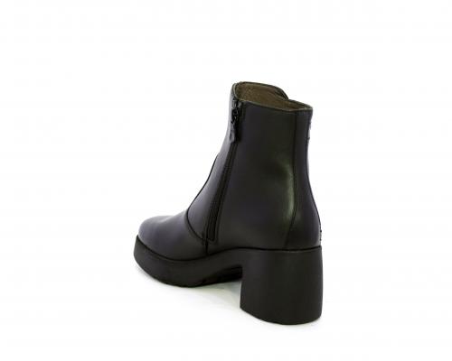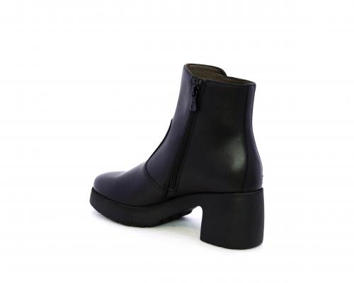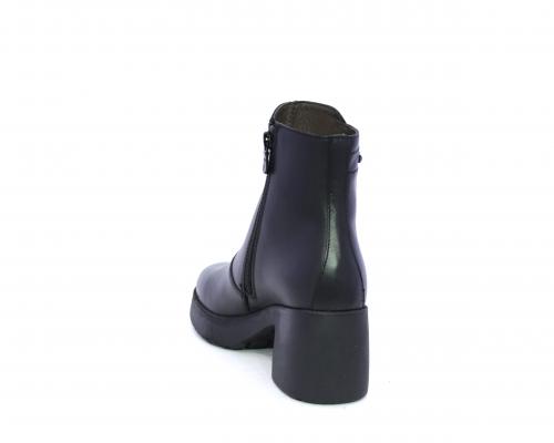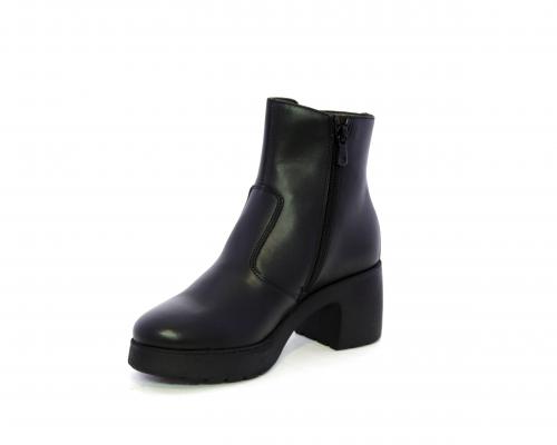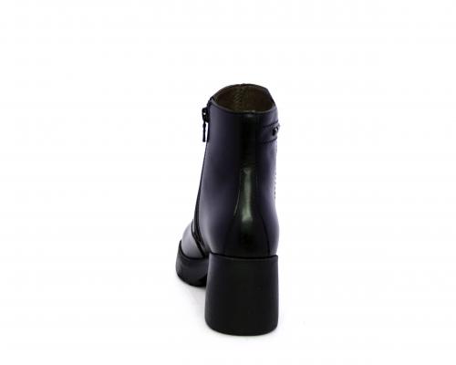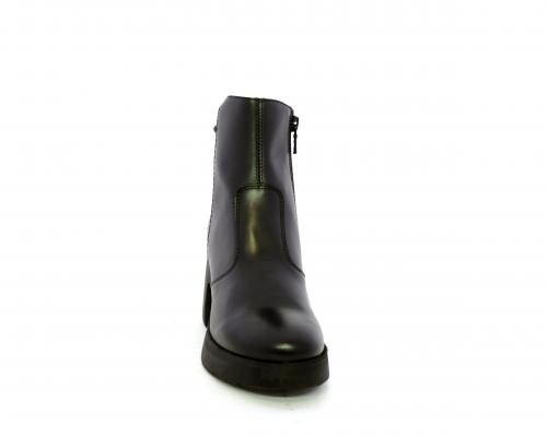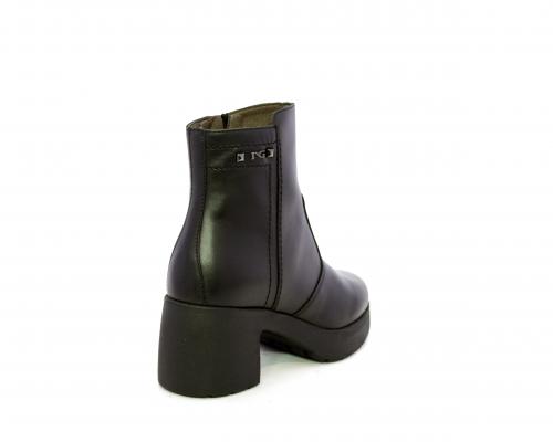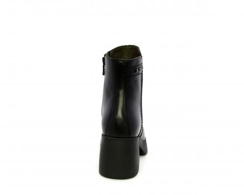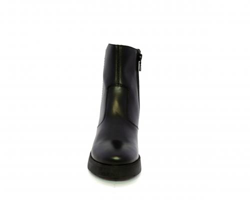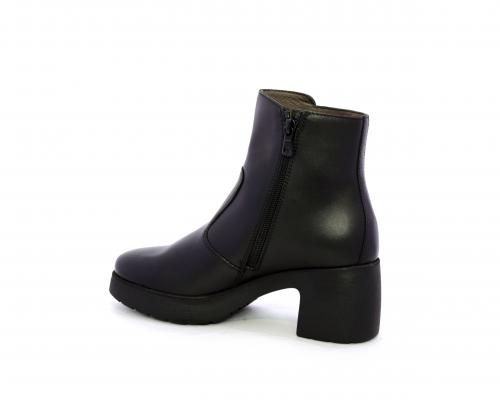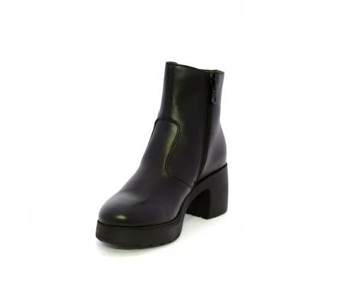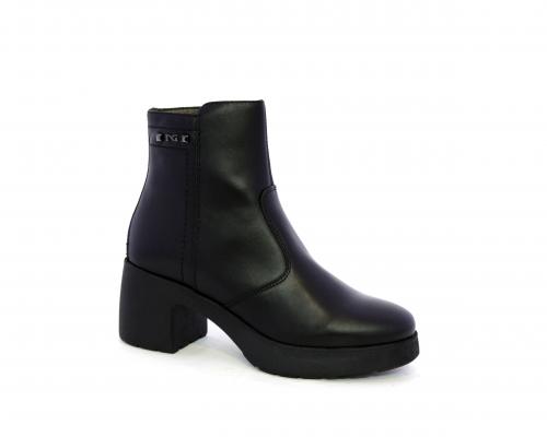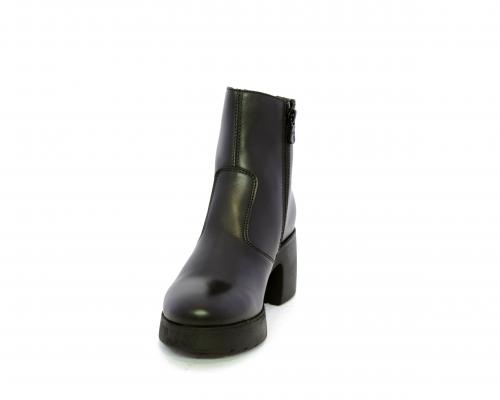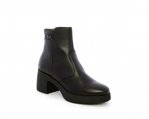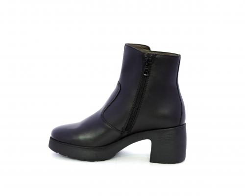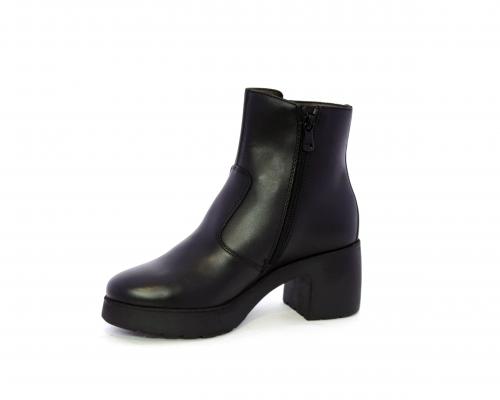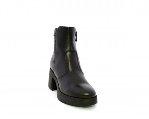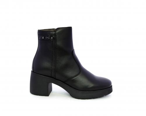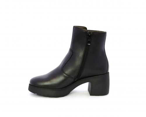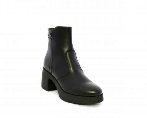 Tronchetto con chiusura laterale, tacco e plateaux in gomma, tomaia in pelle con accessorio laterale in acciaio, sottopiede e fodera interna in pelle, fusbet anatomico.