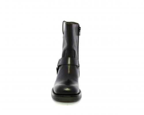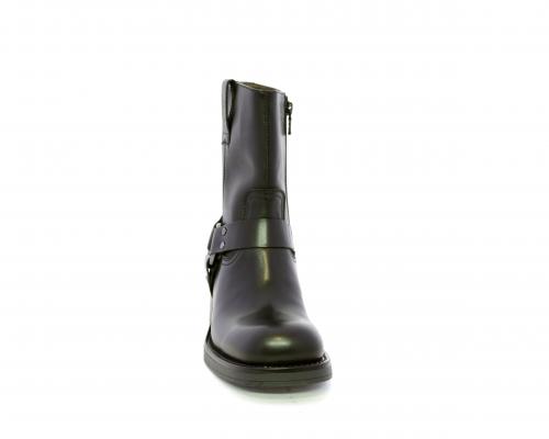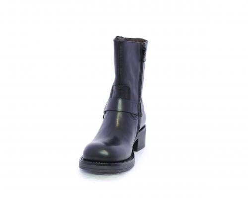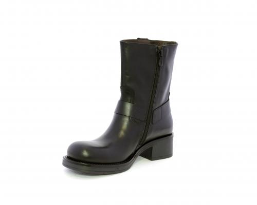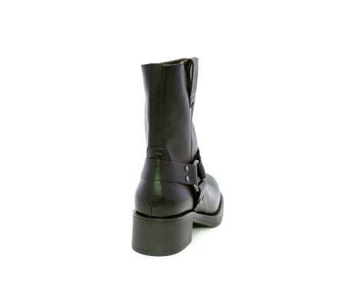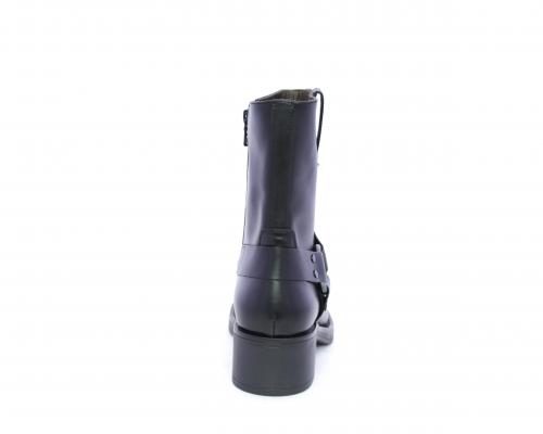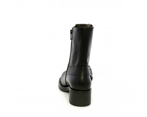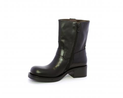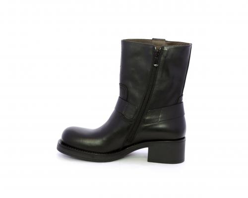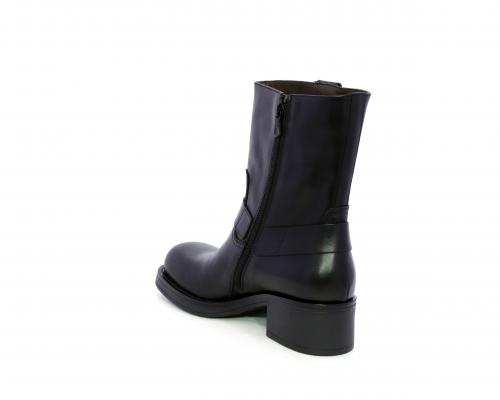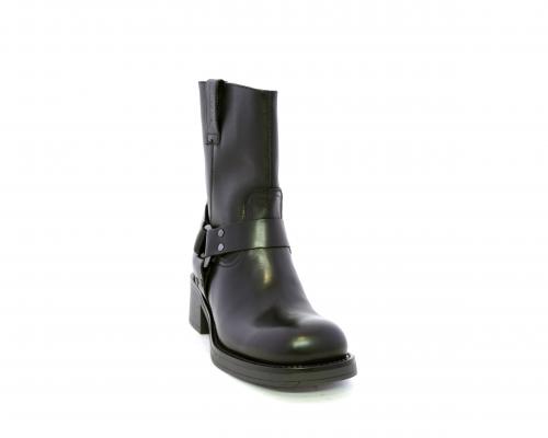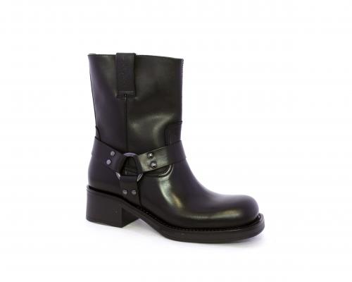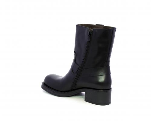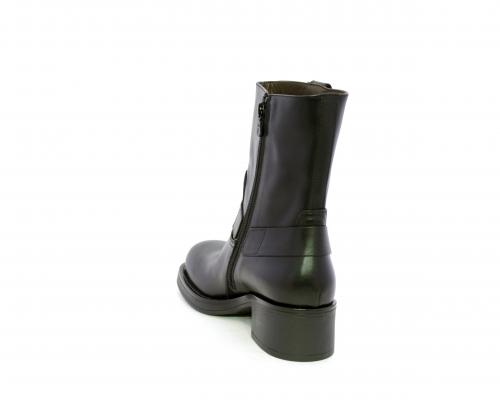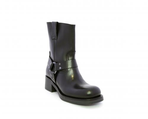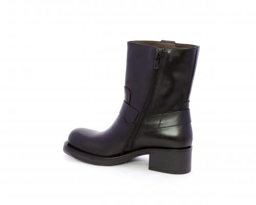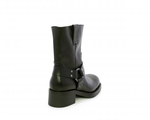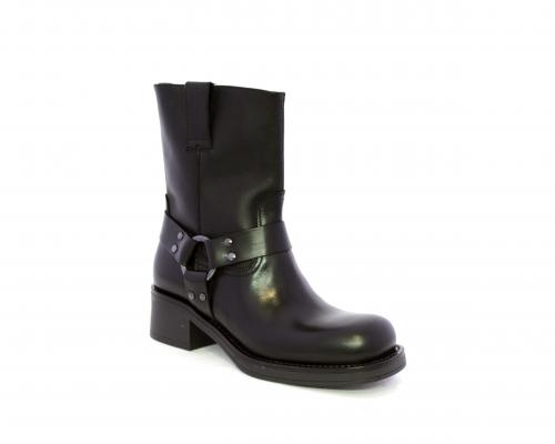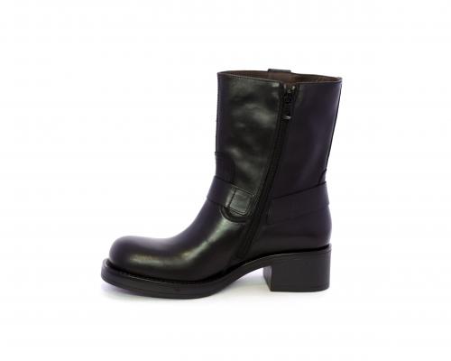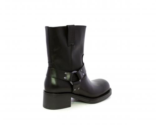 Tronchetto modello biker con chiusura laterale, fondo in gomma, tomaia in pelle con accessori in metallo, punta quandrata, sottopiede e fodera interna in pelle, fusbet anatomico.