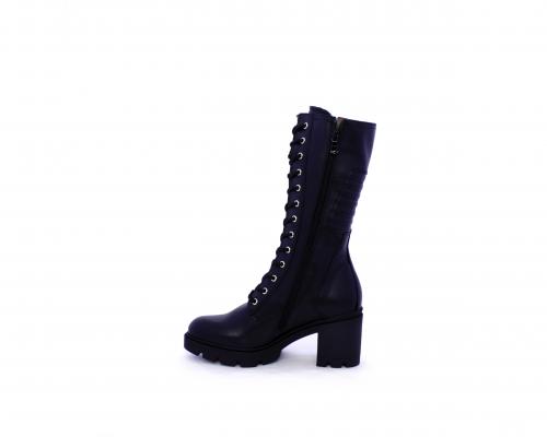 Stivale lungo con lacci e chisura laterale, tacco e fondo in gomma, tomaia in pelle e accessori color oro, sottopiede e fodera interna in pelle, fusbet anatomico.