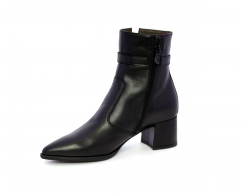 Tronchetto con chiusura laterale, fondo in gomma, tacco largo rivestito in pelle, tomaia in pelle con fibbia laterale color oro, sottopiede e fodera interna in pelle, fusbet anatomico con memory.