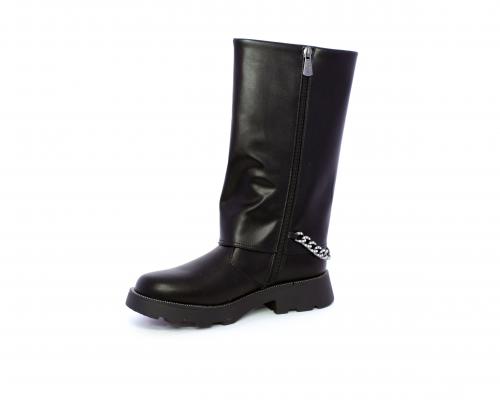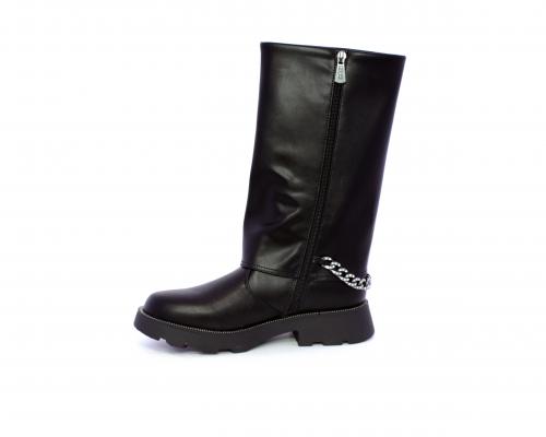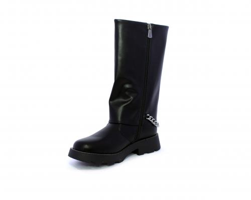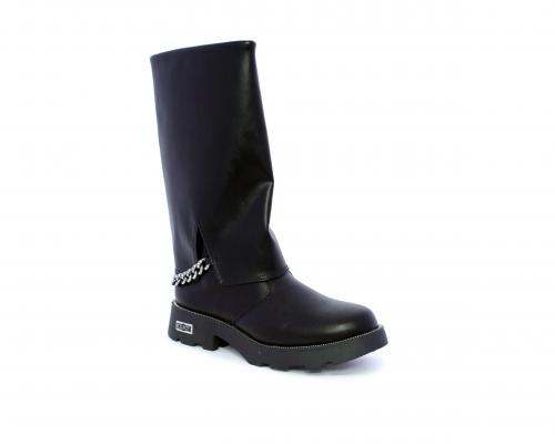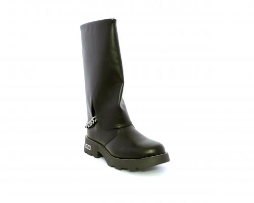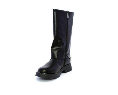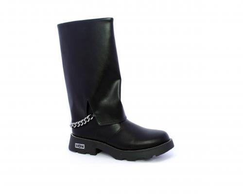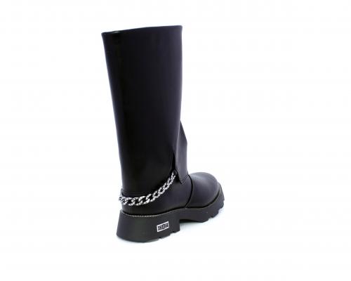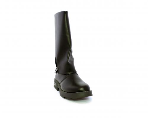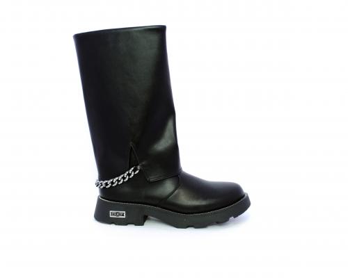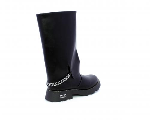 Stivale con chiusura laterale, fondo in gomma con medaglia in acciaio con logo, tomaia in pelle lateralmente catenella in acciaio con brillantini, sottopiede in pelle, fodera interna in tessuto, fusbet anatomico.