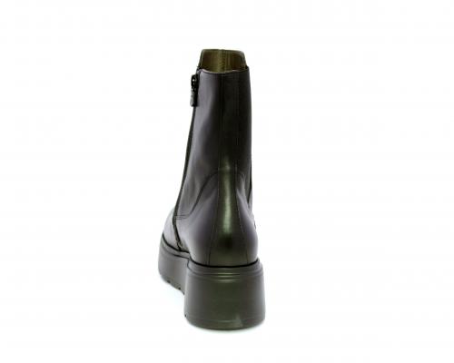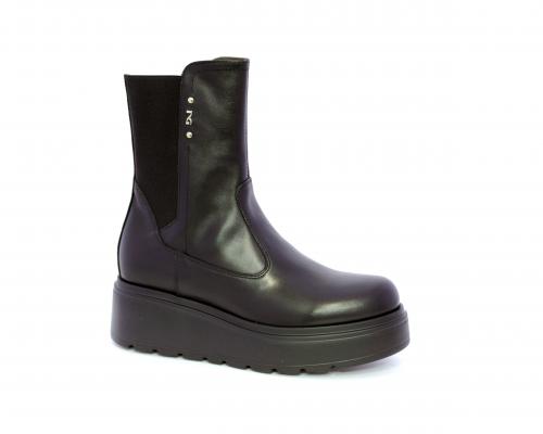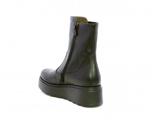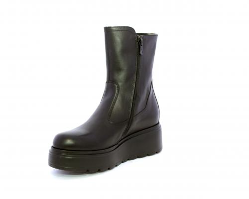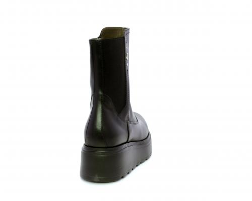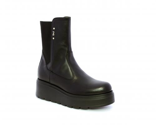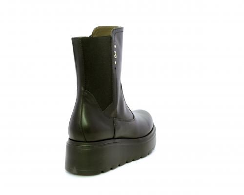 Tronchetto con zeppa e plateaux in gomma, chiusura laterale, tomaia in pelle con parte laterale in tessuto elasticizzato, sottopiede in tessuto, fodera interna in pelle,fusbet estraibile in poliuretano Dry-Go, con doppia capacità sia di assorbire il sudore sia di asciugarsi rapidamente, inoltre ha anche la funzione MEMORY che si modella al piede garantendo confort e benessere.