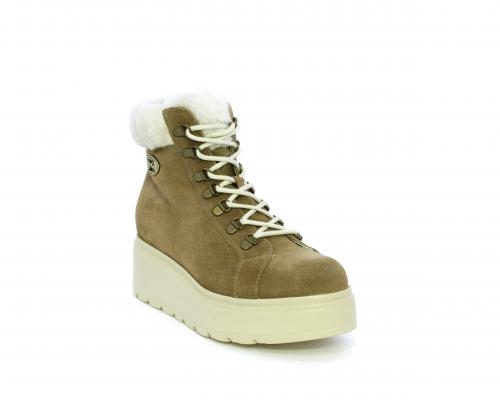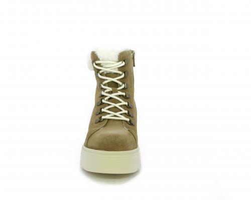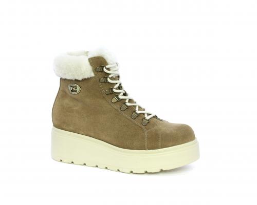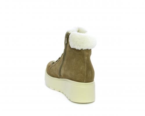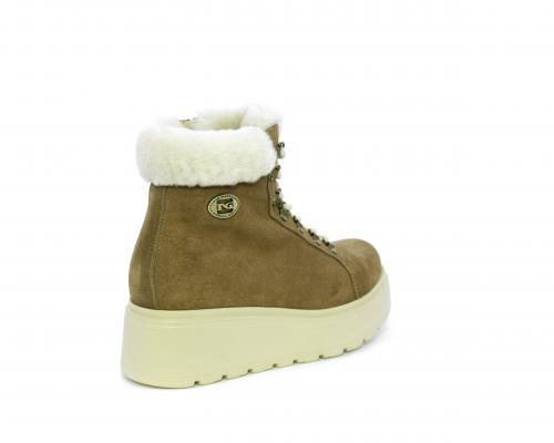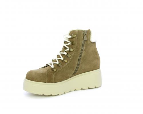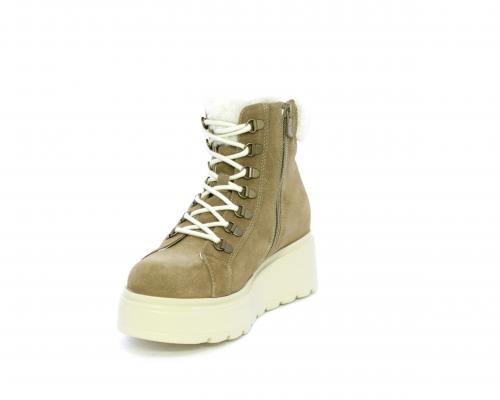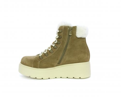 Tronchetto con zeppa e plateaux in gomma, con lacci e chiusura laterale, tomaia in camoscio con pelliccia ecologica, sottopiede in tessuto, fodera interna in pelle,fusbet estraibile in poliuretano Dry-Go, con doppia capacità sia di assorbire il sudore sia di asciugarsi rapidamente, inoltre ha anche la funzione MEMORY che si modella al piede garantendo confort e benessere.