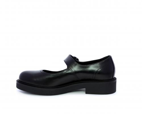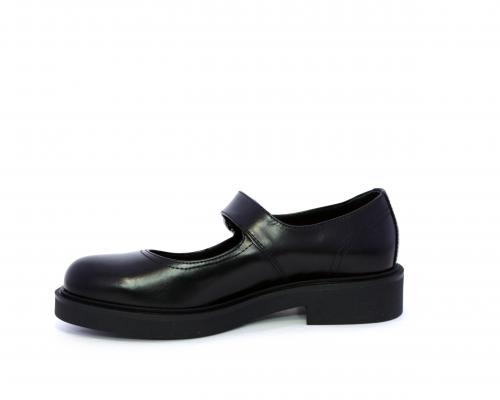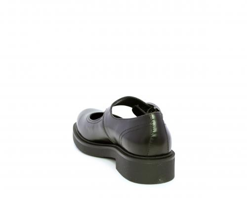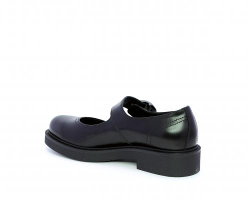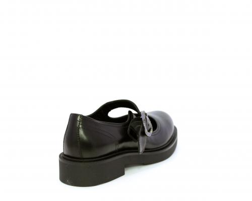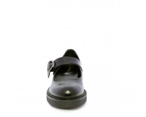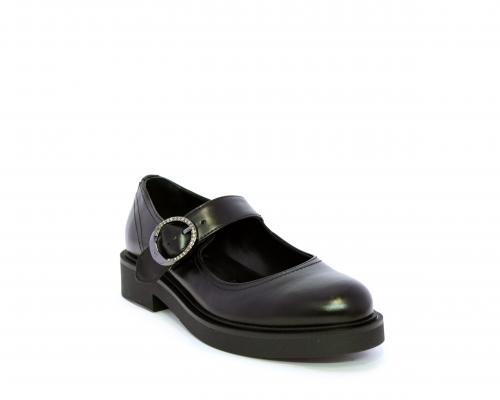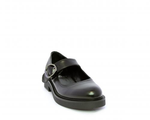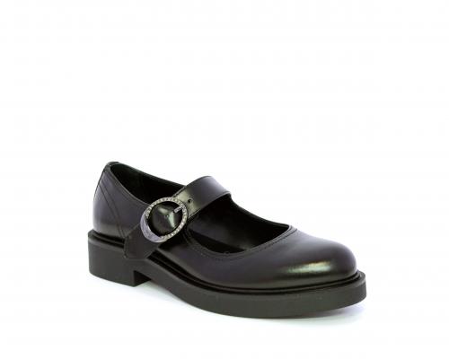 Scarpa modello ballerina con cinturino in pelle regolabile, tacco e fondo in gomma, tomaia in pelle con brillantini sulla fibbia, sottopiede e fodera interna in pelle, fusbet con memory.