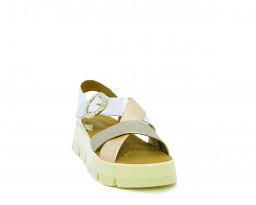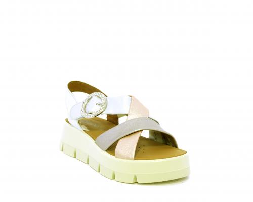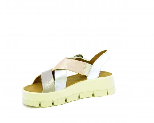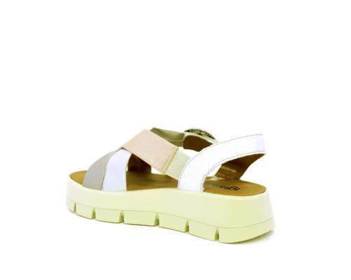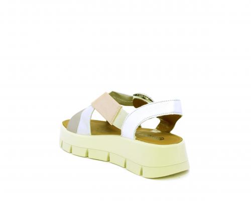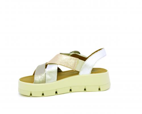 Sandalo con fondo in gomma, tomaia in pelle satinata con incrocio sul collo del piede, fibbia regolabile ed elastico, sottopiede in pelle, fusbet anatomico.
