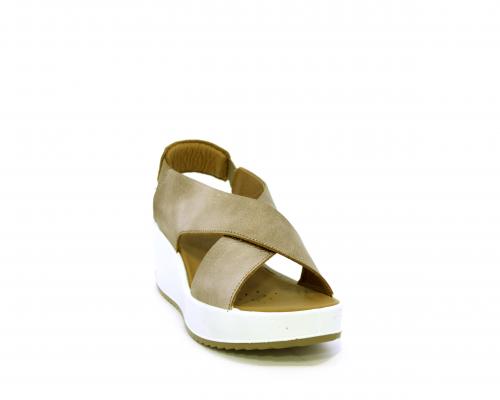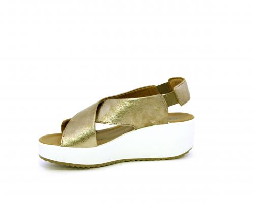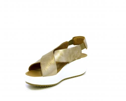 Sandalo con fondo in gomma, tomaia in pelle satinata, modello ad incrocio con doppio elastico al cinturino dietro la caviglia, sottopiede in pelle, fusbet anatomico.