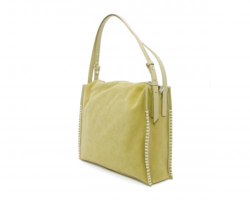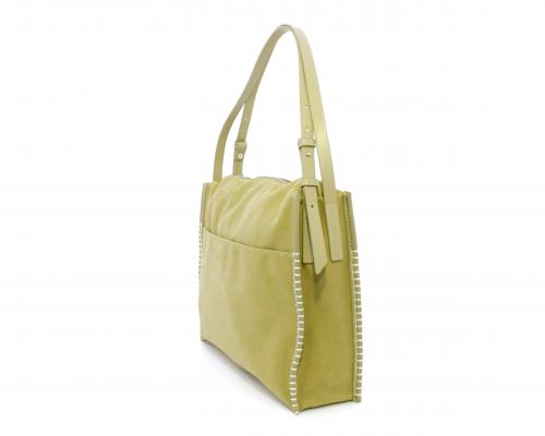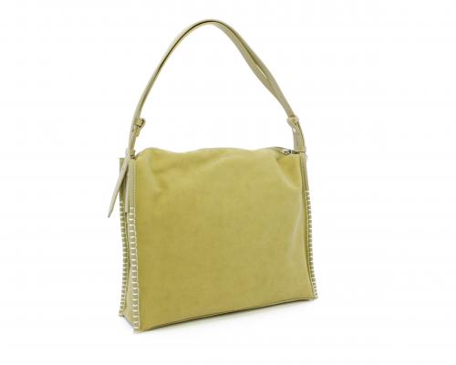 Borsa monospalla con forma rettangolare, doppio manico lungo regolabile, in camoscio e rifiniture in ecopelle, taschino nella parte anteriore con calamita, chiusura generale della borsa con cerniera, fodera interna in tessuto con doppio taschino uno aperto e uno chiuso con zip.