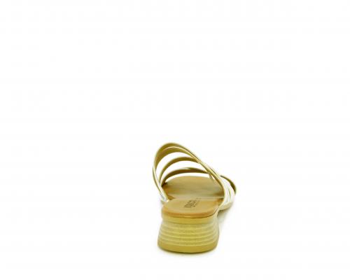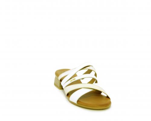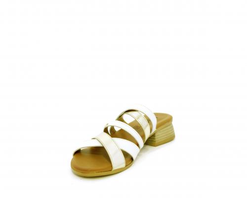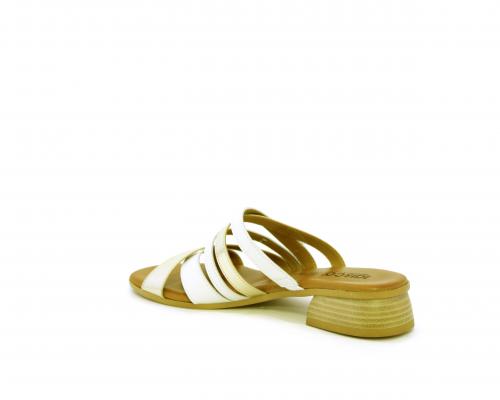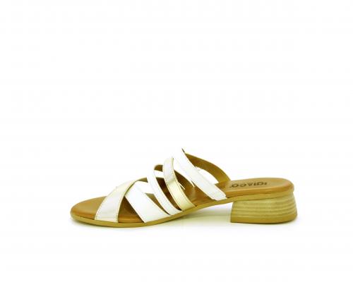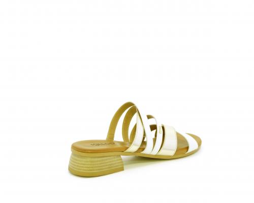 Sandalo con tacco effetto legno, fondo in gomma, tomaia in pelle bianca e pelle satinata platino con elastico alla fascia sul collo del piede, sottopiede e fodera interna in pelle, fusbet con memory.