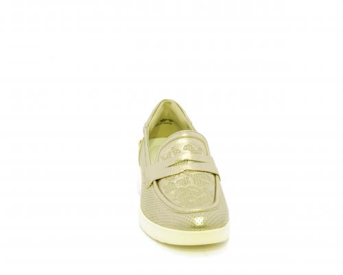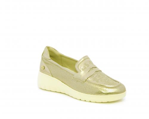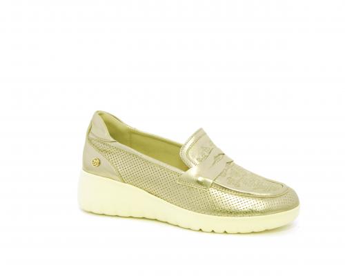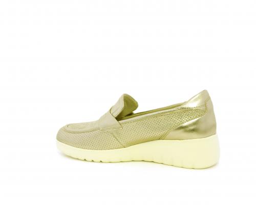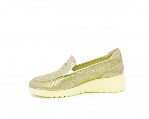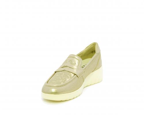 Mocassino con zeppa e plateux in gomma, tomaia in pelle satinata, sottopiede in pelle, fodera intena in suede, fusbet estraibile con memory flex per rendere la calzatura ancora più flessibile e leggera.